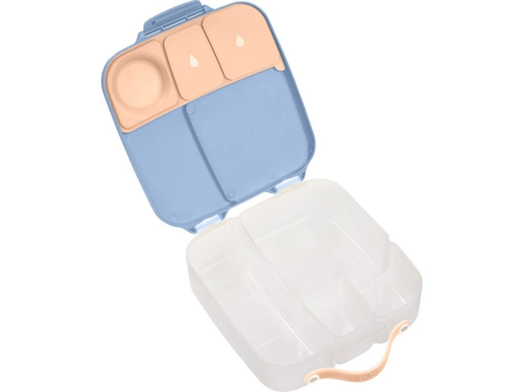 Krabička na svačinu, do které se vejde úplně všechno! Děti si během dne rády vybírají z dobrot, které jim připravíte. A tak b.box navrhl variabilní lunchbox, do kterého zabalíte nespočet různých druhů svačinek. Najdete zde oddělení pro půl krajíce chleba nebo sendvič, pod pohyblivým víčkem je ukrytý chladivý polštářek, který udrží tuto dobrotu déle čerstvou. Pokud pohyblivé víčko odstraníte, máte rázem dostatečně velký prostor pro těstoviny nebo salát. Naprosto jedinečné zpracování víčka krabičky s elastickým kroužkem umožní vložit do krabičky celé jablko! Silikonové dvojité víčko pak umožní skladovat v menších odděleních ovoce nebo jogurt (nikoli tekutity). Některé vitřní "přepážky" jsou vyjímatelné a nastavitelné, takže si tento svačinový box přestavíte podle svých chutí a potřeb. Do lunchboxu se vejde i wrap nebo banán.