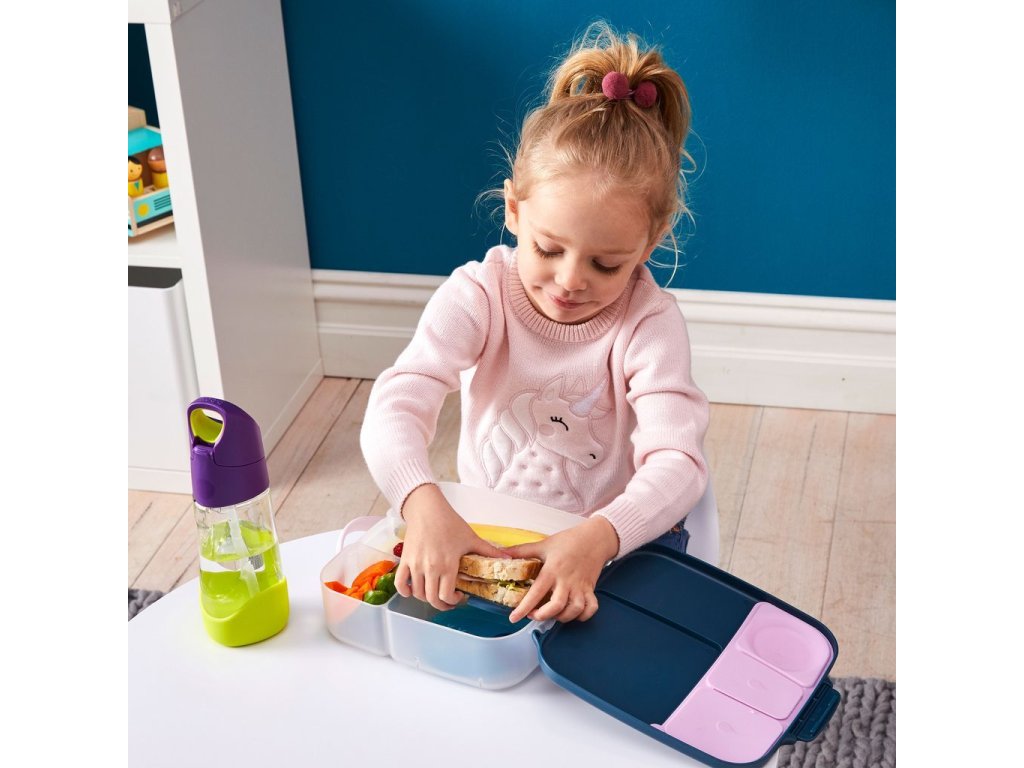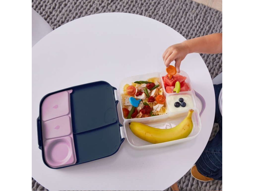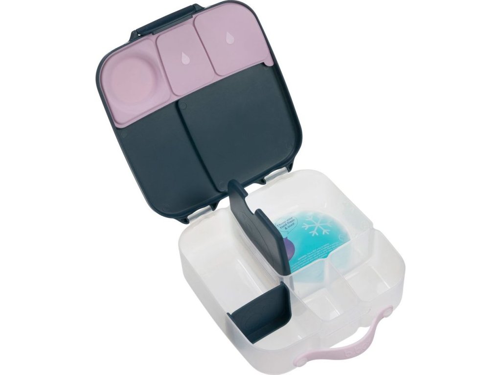 Krabička na svačinu, do které se vejde úplně všechno! Děti si během dne rády vybírají z dobrot, které jim připravíte. A tak b.box navrhl variabilní lunchbox, do kterého zabalíte nespočet různých druhů svačinek. Najdete zde oddělení pro půl krajíce chleba nebo sendvič, pod pohyblivým víčkem je ukrytý chladivý polštářek, který udrží tuto dobrotu déle čerstvou. Pokud pohyblivé víčko odstraníte, máte rázem dostatečně velký prostor pro těstoviny nebo salát. Naprosto jedinečné zpracování víčka krabičky s elastickým kroužkem umožní vložit do krabičky celé jablko! Silikonové dvojité víčko pak umožní skladovat v menších odděleních ovoce nebo jogurt (nikoli tekutity). Některé vitřní "přepážky" jsou vyjímatelné a nastavitelné, takže si tento svačinový box přestavíte podle svých chutí a potřeb. Do lunchboxu se vejde i wrap nebo banán.