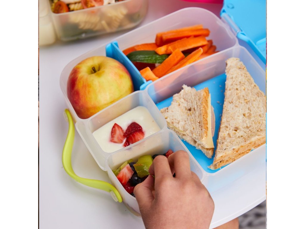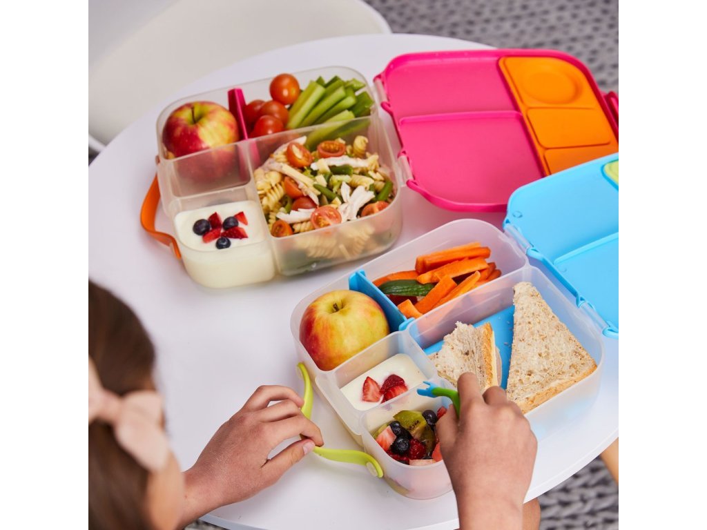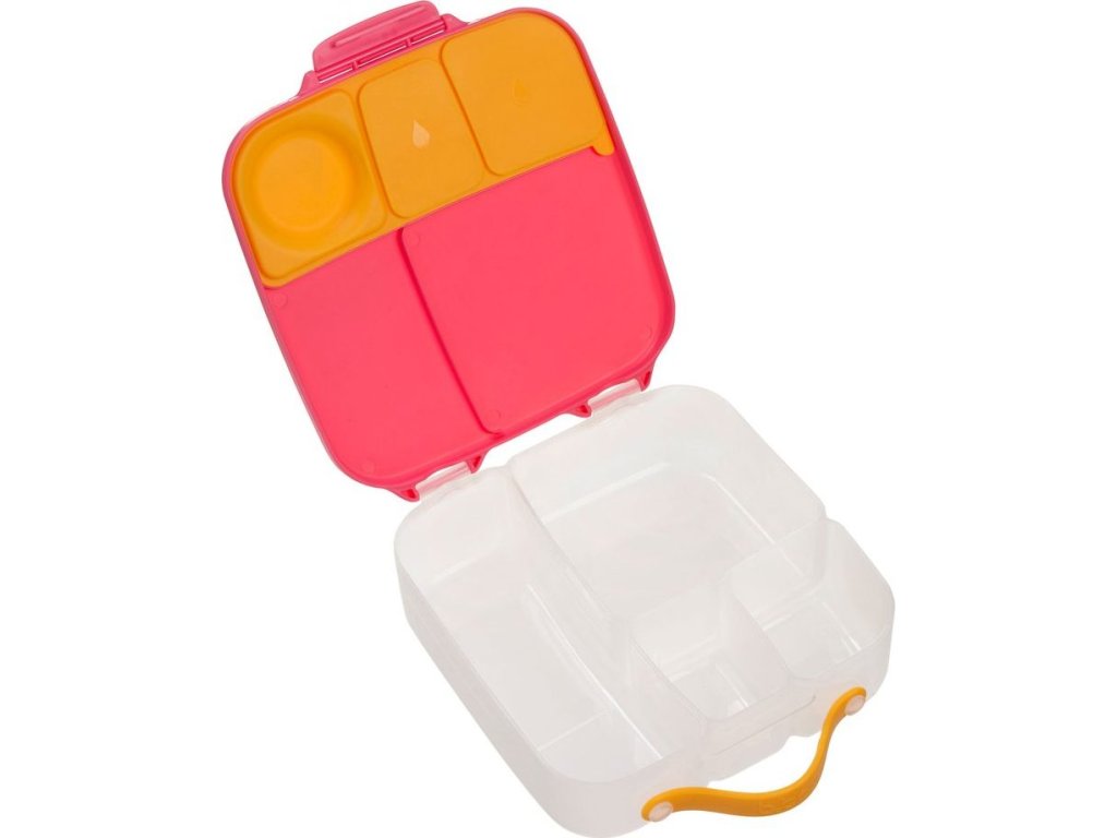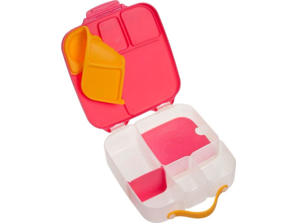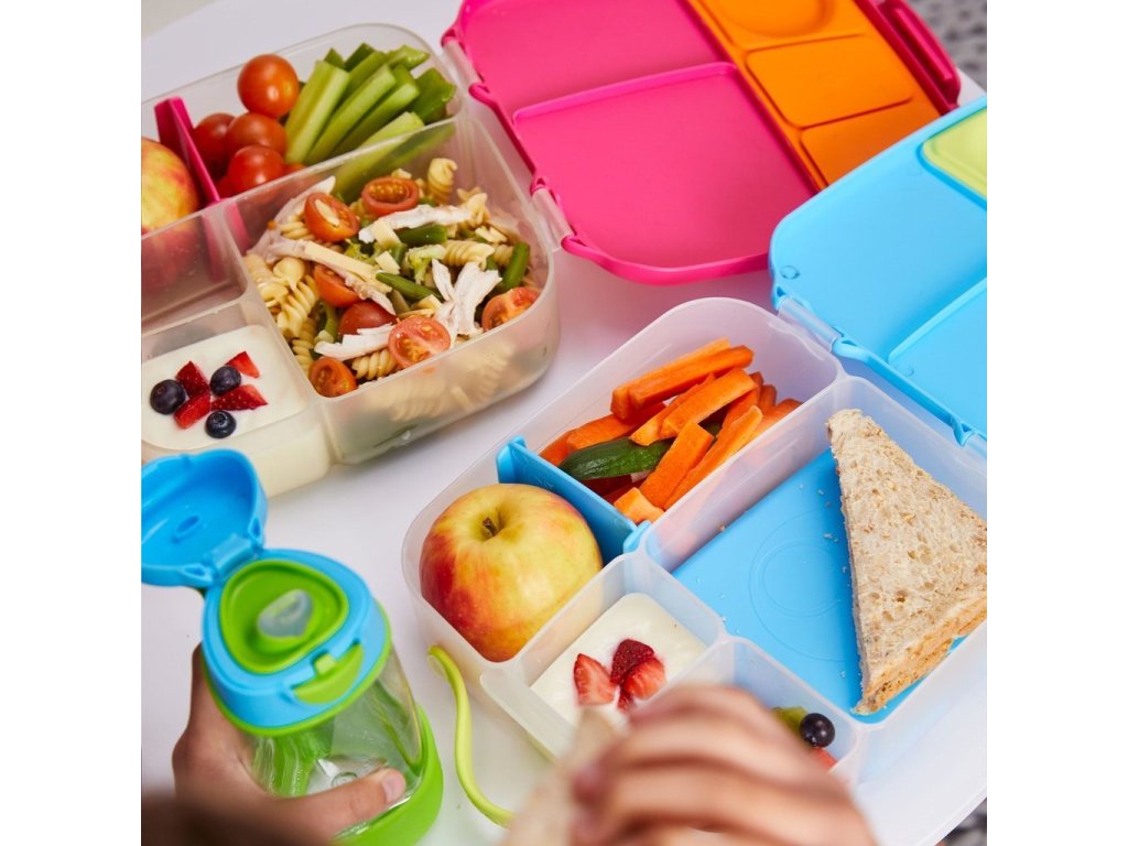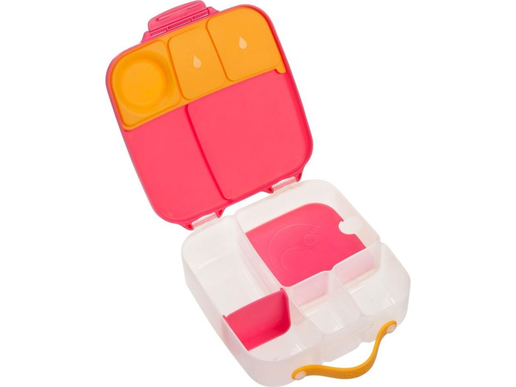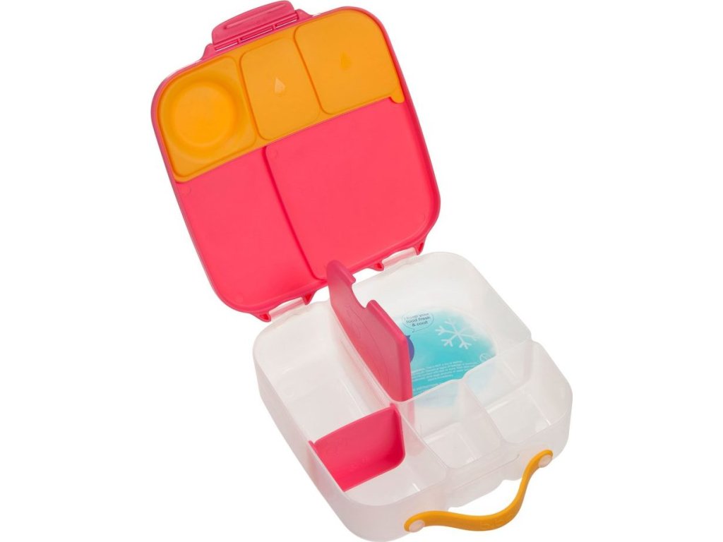 Krabička na svačinu, do které se vejde úplně všechno! Děti si během dne rády vybírají z dobrot, které jim připravíte. A tak b.box navrhl variabilní lunchbox, do kterého zabalíte nespočet různých druhů svačinek. Najdete zde oddělení pro půl krajíce chleba nebo sendvič, pod pohyblivým víčkem je ukrytý chladivý polštářek, který udrží tuto dobrotu déle čerstvou. Pokud pohyblivé víčko odstraníte, máte rázem dostatečně velký prostor pro těstoviny nebo salát. Naprosto jedinečné zpracování víčka krabičky s elastickým kroužkem umožní vložit do krabičky celé jablko! Silikonové dvojité víčko pak umožní skladovat v menších odděleních ovoce nebo jogurt (nikoli tekutity). Některé vitřní "přepážky" jsou vyjímatelné a nastavitelné, takže si tento svačinový box přestavíte podle svých chutí a potřeb. Do lunchboxu se vejde i wrap nebo banán.