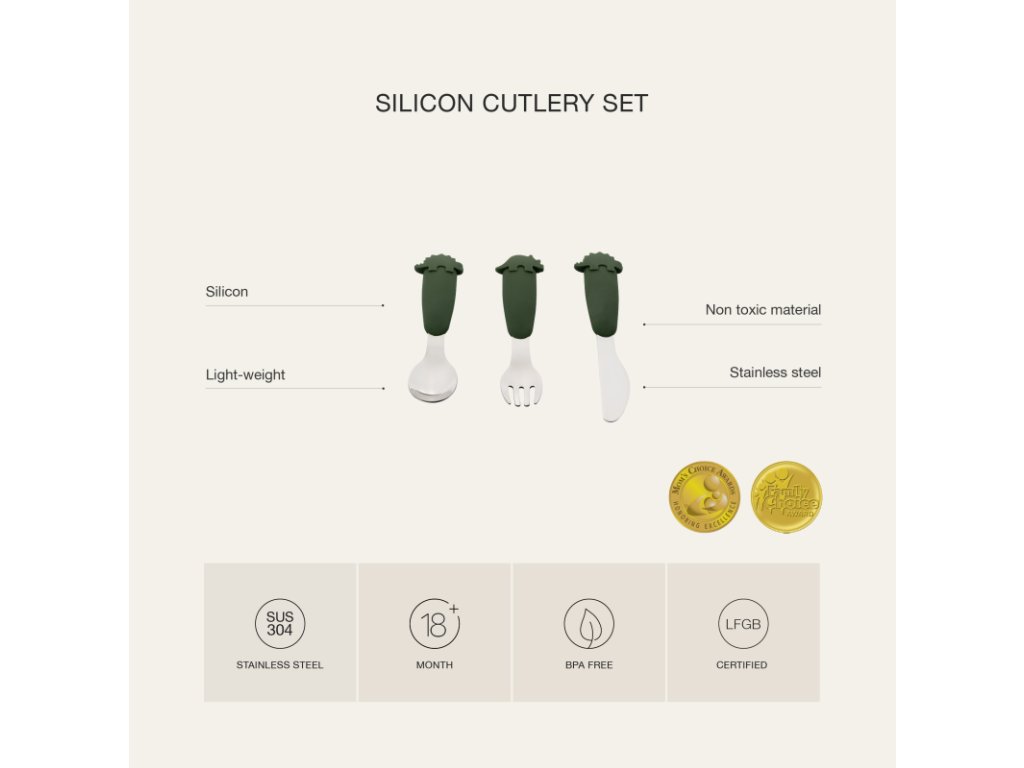 Příbory jsou vyrobeny z potravinářské nerezové oceli třídy 304 prodlužující životnost výrobku, rukojeti jsou ze silikonu.