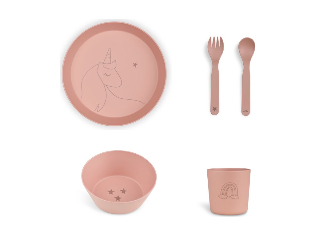 - Obsahuje talířek, misku, hrneček a příbor (vidličku a lžíci) s exkluzivním potiskem