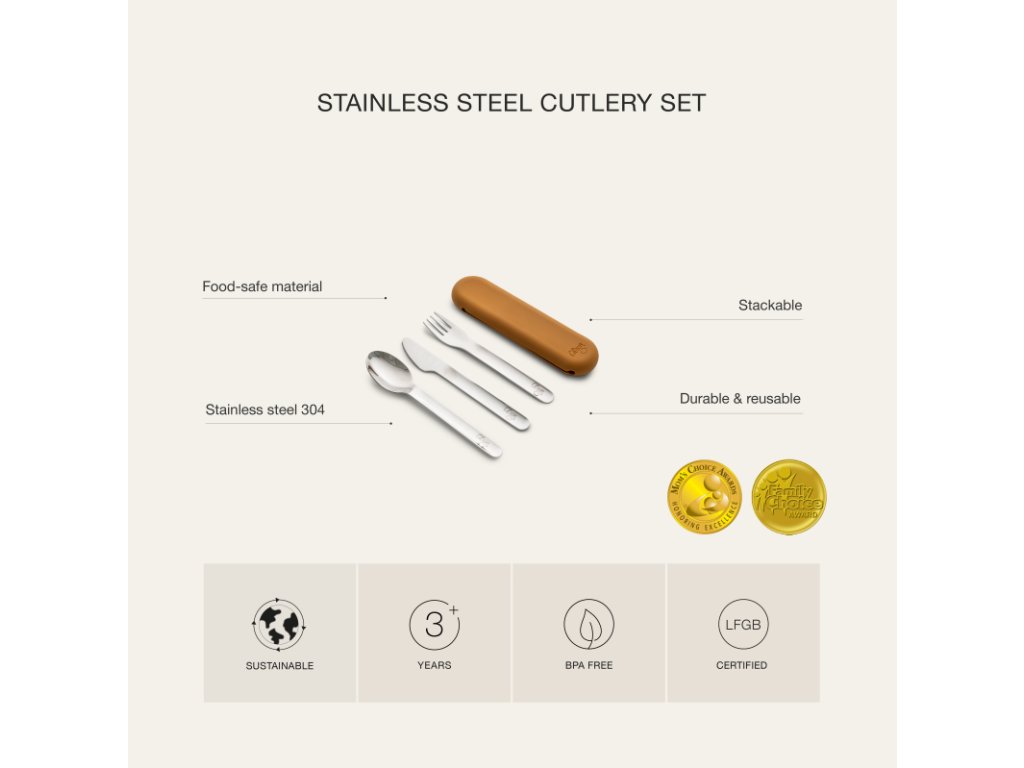 Příbory jsou vyrobeny z potravinářské nerezové oceli třídy 304 prodlužující životnost výrobku, zatímco pouzdro je vyrobeno z bezpečného silikonu.