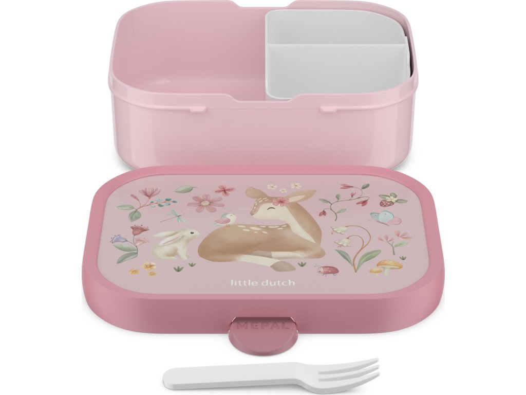 Praktický svačinový box nabízí možnost rozdělení na tři přihrádky pro oddělení jednotlivých částí uložené svačinky. Součástí boxu je i malá vidlička, která je ideální pro napichování kousků ovoce či zeleniny. Zacvakávací uzávěr je zárukou bezpečného uzavření obsahu boxu.
