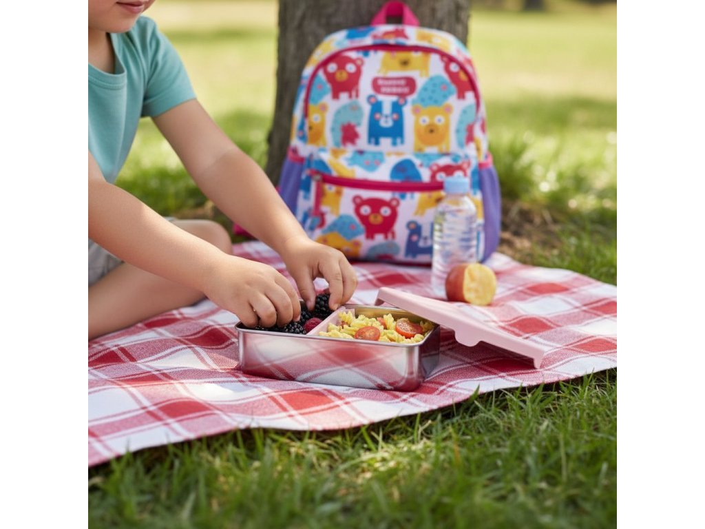 Tato nerezová bento krabička kanadské značky Melii kombinuje odolné nerezové tělo, silikonové víčko a posuvnou odnímatelnou přepážku, kterou si snadno přizpůsobíte podle potřeby. Je ideální pro rozdělení svačiny, oddělení příloh, ovoce, zeleniny nebo hlavního jídla.