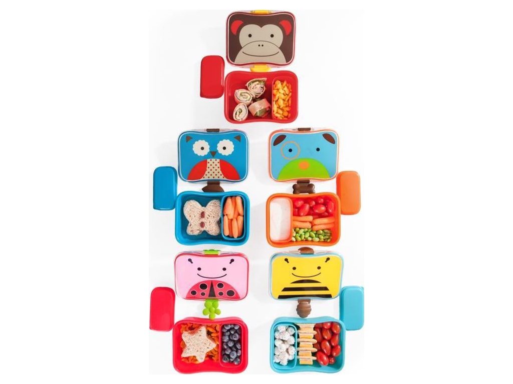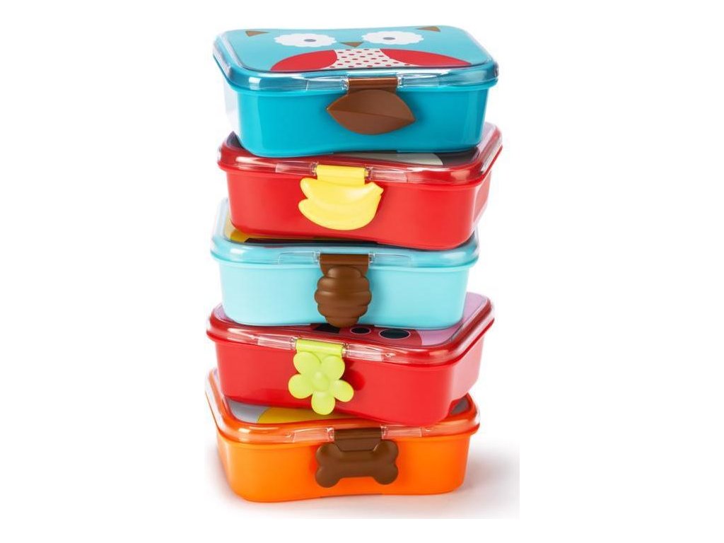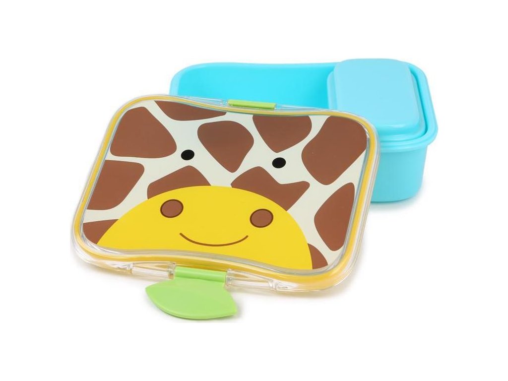 Krásná krabička na svačinu ve stylu Skip Hop, v designu Zoo kolekce, skládá se ze 2 dílů: krabička na svačinu s nepropustným víčkem a menší krabička na piškoty.