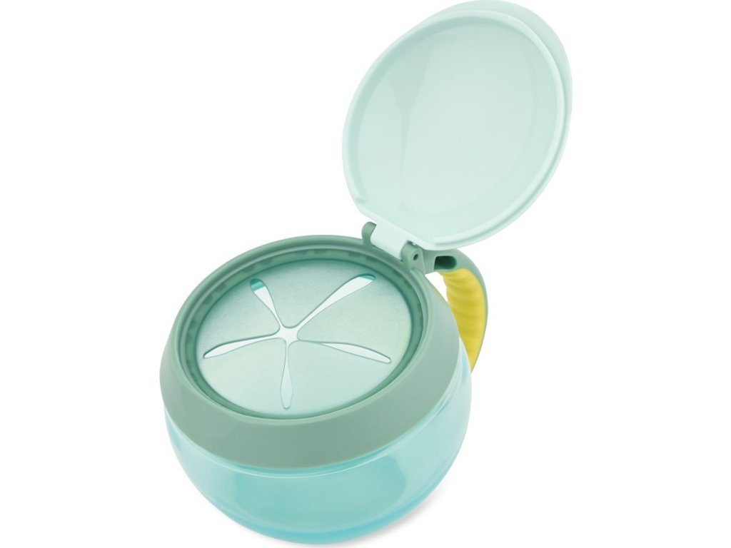 Šikovný nápad na cesty. Nádoba má víčko, které po otevření drží, před vysypáním obsahu jej chrání pružné lamely, které pustí dětskou ručičku dovnitř, ale nepustí svačinu ven. Nádoba je průhledná, aby se mohla brzy doplnit. Na boku je praktické ouško v dětském rozměru, pomocí kterého lze nádobu připevnit i na kočárek či tašku. 0% BPA, 0% PVC, bez ftalátů. Obsah: 222 ml. Průměr: 10 cm