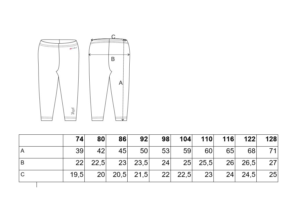vel.98 - 38 cm (délka kroku), 26 cm (šířka), 8 cm (šířka nohavice), 19 cm (hloubka sedu PD), 22 cm (hloubka sedu ZD)