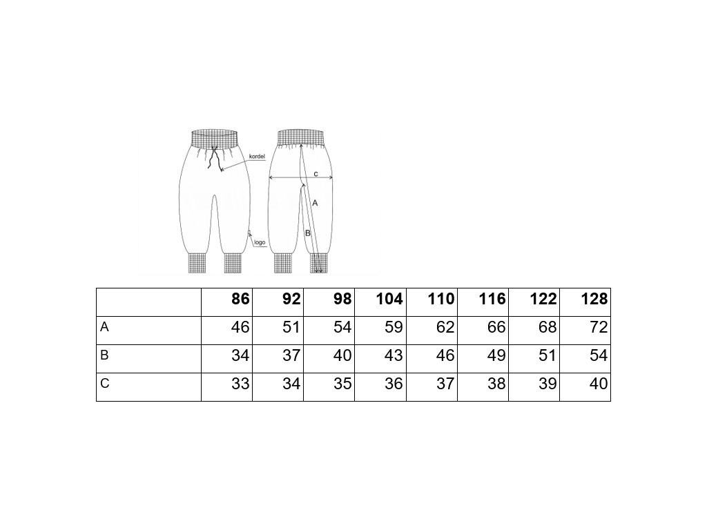 Tepláky hřejivé mají pohodlný ležérní střih, který skvěle padne na každou postavu. V pase je možné je stáhnout šňůrkou. Díky svému módnímu provedením jsou zajímavé hned na první pohled. Pas a nohavice jsou opatřeny širokým nápletem, který můžete ohrnout. Díky tomu lze tepláky individuálně upravit podle výšky dítěte. Vydrží vám více velikostí.