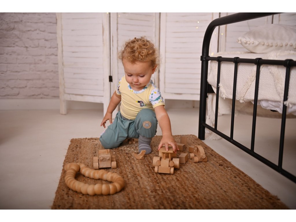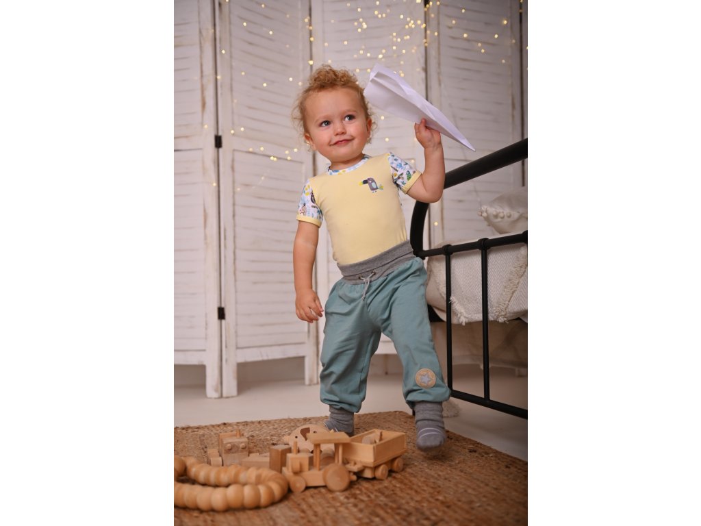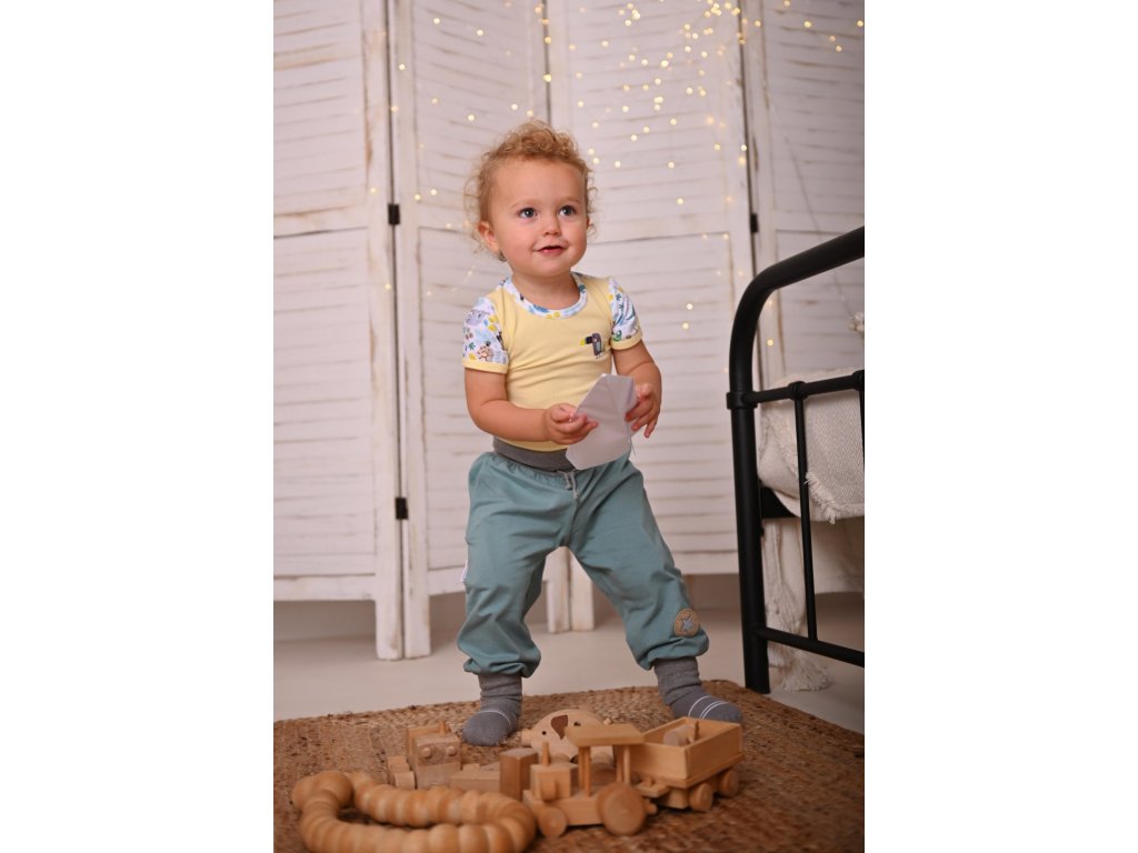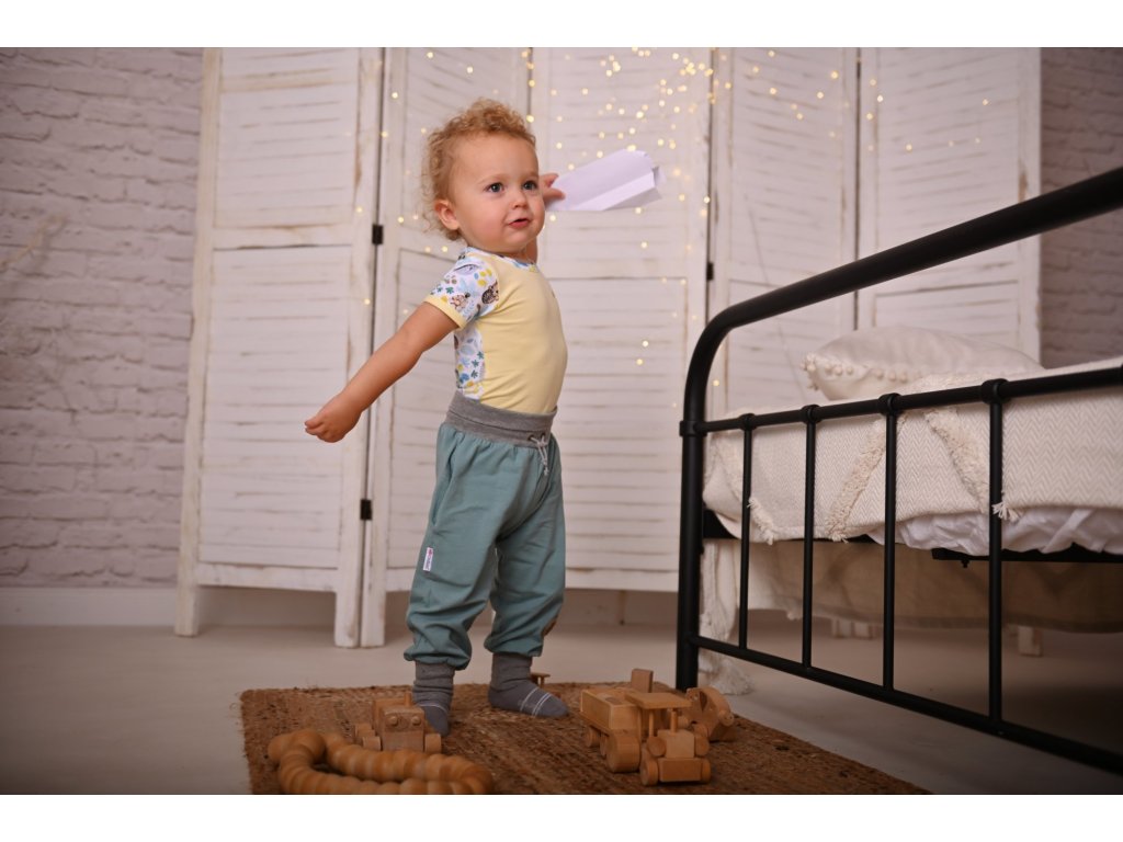 Tepláky s kapsou mají široký pružný náplet v pase a na nohavicích. Díky tomu tepláčky drží, nelezou, neodstávají a přizpůsobí se každému tvaru tělíčka. Jsou pohodlné a pružné. Ohrnutím nebo spuštěním nápletů na nohavicích a v pase můžete regulovat délku tepláků, když dítě povyroste. Reflexní logo na dolní části nohavice podporuje viditelnost.
