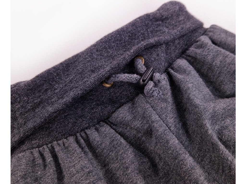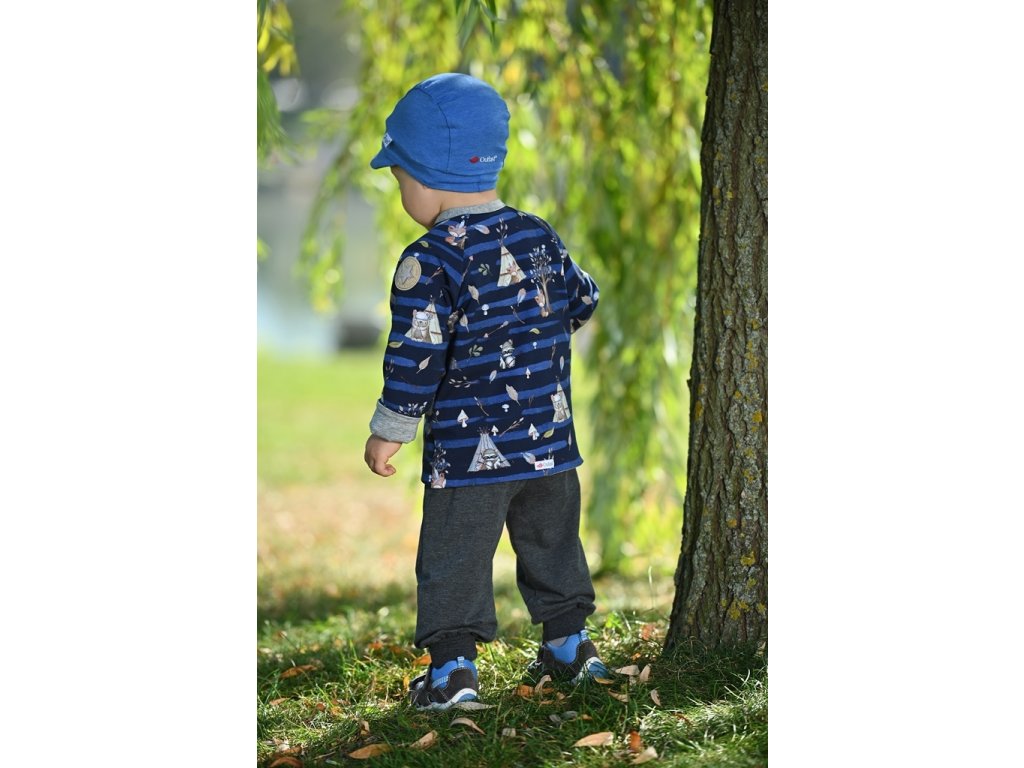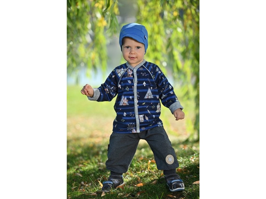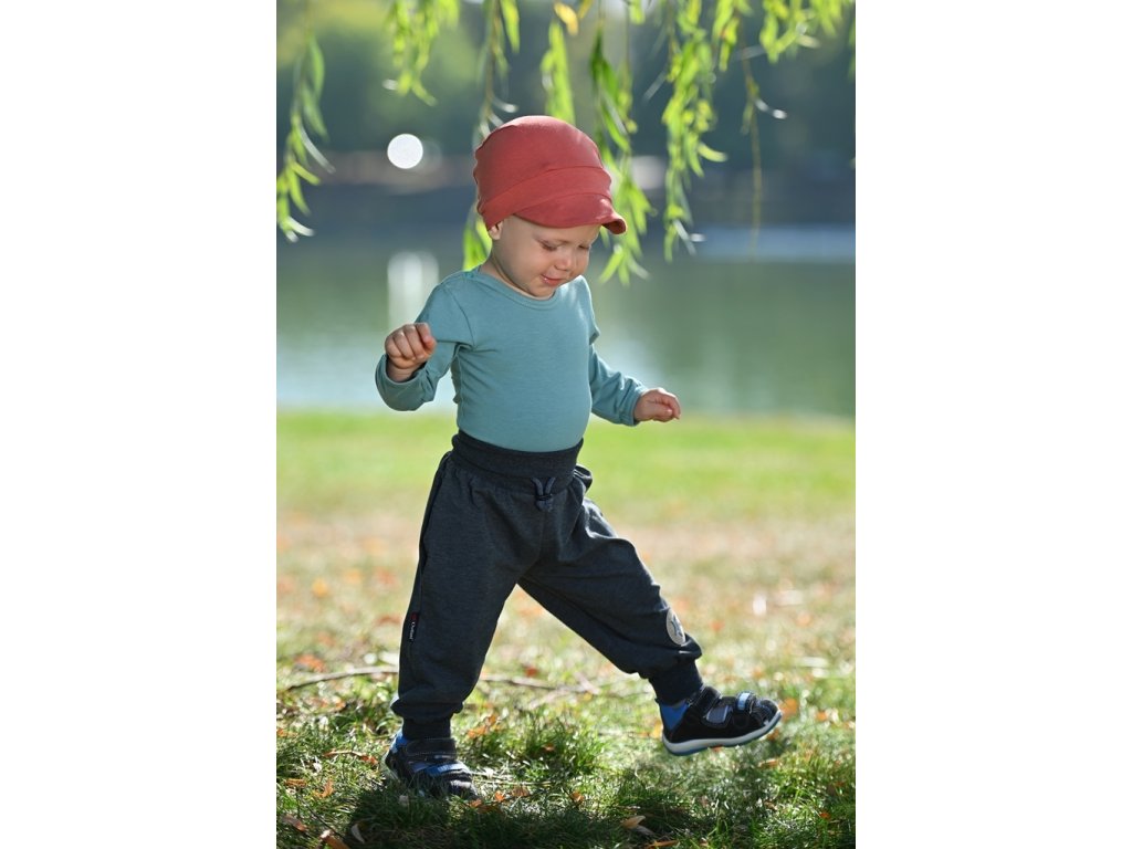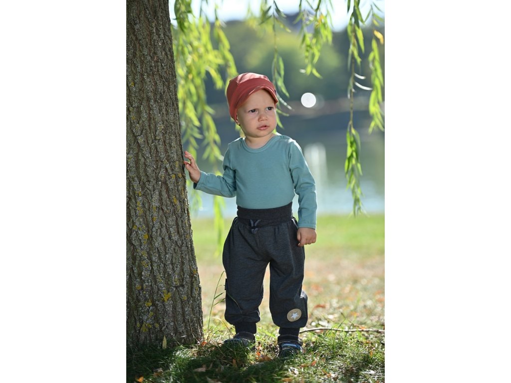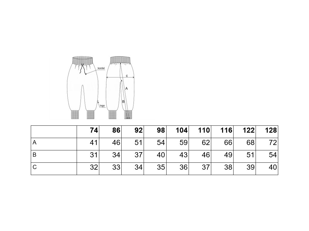 Tepláky s kapsou mají široký pružný náplet v pase a na nohavicích. Díky tomu tepláčky drží, nelezou, neodstávají a přizpůsobí se každému tvaru tělíčka. Jsou pohodlné a pružné. Ohrnutím nebo spuštěním nápletů na nohavicích a v pase můžete regulovat délku tepláků, když dítě povyroste. Reflexní logo na dolní části nohavice podporuje viditelnost.