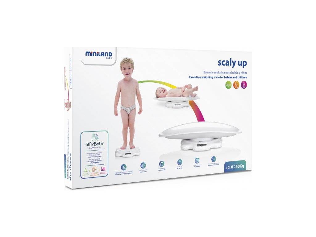 Digitální váha Miniland Scaly Up je určena pro děti od narození do 50 kg. Díky výměnnému nástavci je možné váhu používat pro ležící miminko i pro dítě, které na váze umí stát.