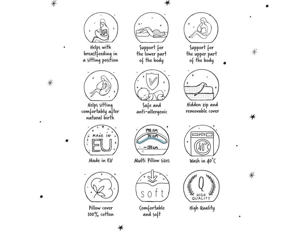 - Velký, pohodlný polštář dopřeje relaxaci, významně zlepšuje komfort fungování budoucí maminky a miminka.