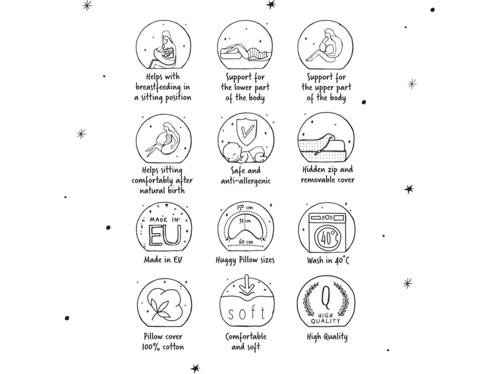 - Polštář Huggy pomáhá v době odpočinku a při spaní s velkým bříškem. Když už je děťátko na světě, usnadní krmení, uleví zádům a umožňuje zaujmout pohodlnou pozici při kojení.