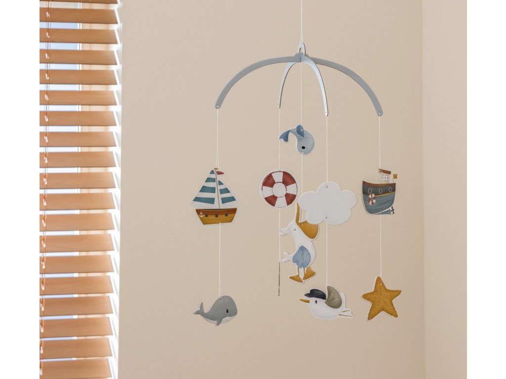 Dekorativní kolotoč s krásnými motivy kolekce Námořnický záliv upoutá pozornost vašeho dítěte v postýlce a stane se i originální dekorací dětského pokoje. Plachetnice, rackové, velryby a další motivy ze života na moři pomohou rozvíjet zrak dítěte a zároveň se jejich pozorováním uklidní před spaním.