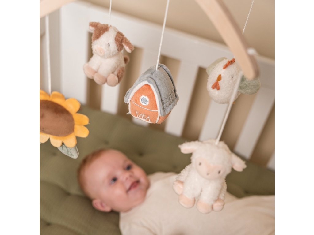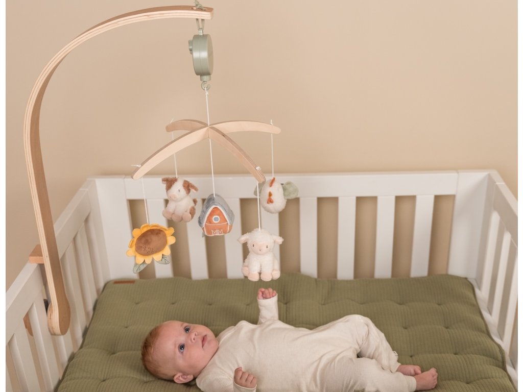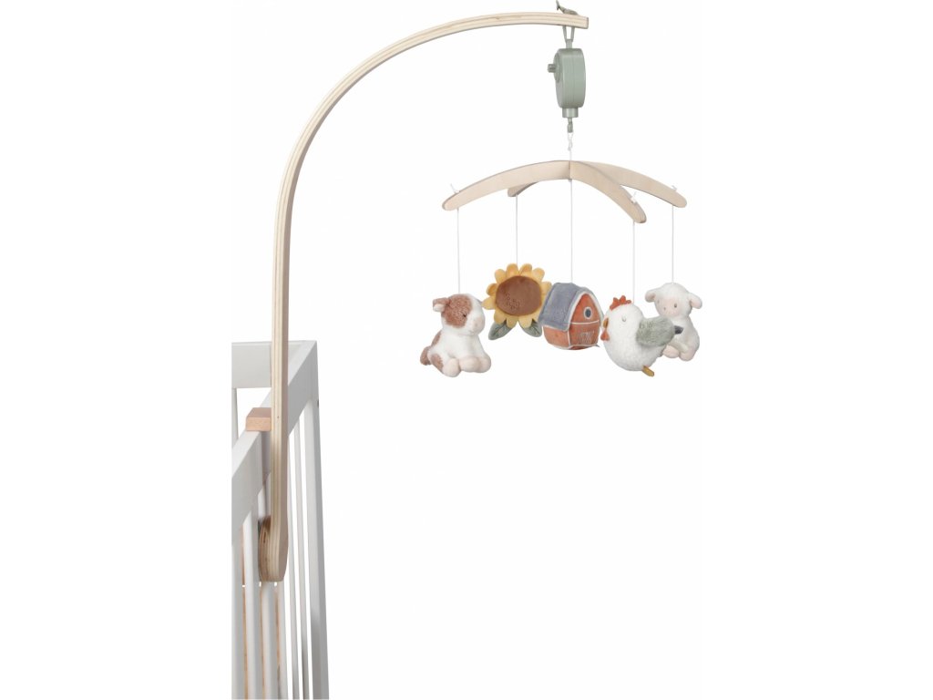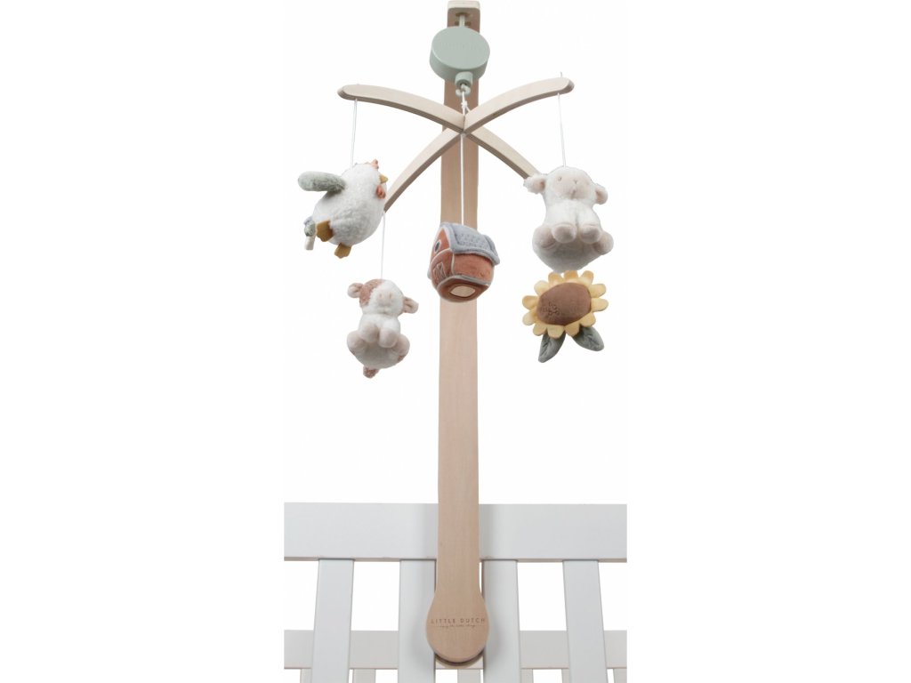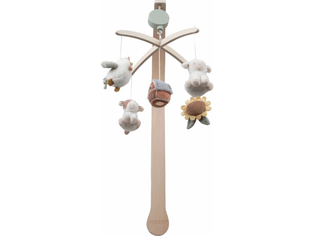 Krásný dřevěný kolotoč z kolekce hraček Little Dutch Farma hraje po natažení ukolébavku pro uklidnění vašeho miminka před spaním. Pozornost dítěte upoutá pět otáčejících se hraček v podobě zvířátek a motivů ze života na farmě.