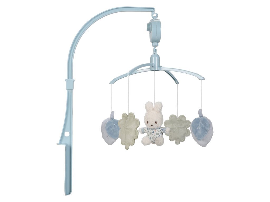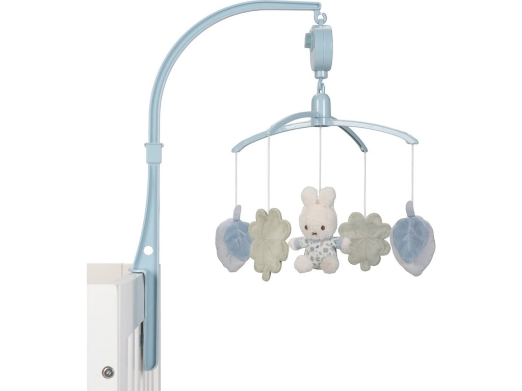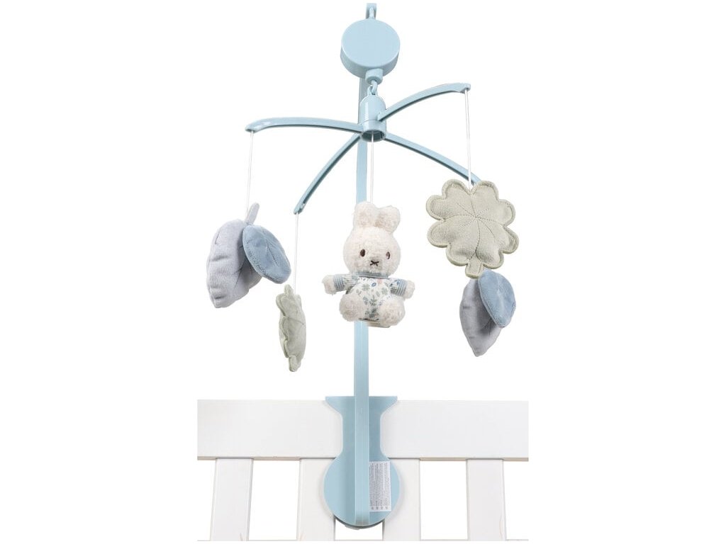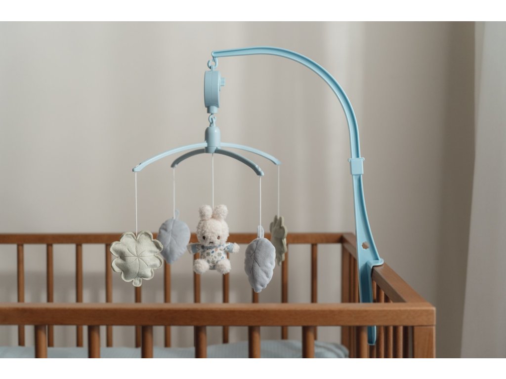 Kolotoč s natahovacím hudebním boxem hraje něžnou ukolébavku pro klidné usínání. Pozornost dítěte upoutají otáčející se plyšové hračky v podobě králíčka Miffy a listů různých tvarů v pastelových barvách. Kolotoč snadno připevníte na bočnici postýlky.