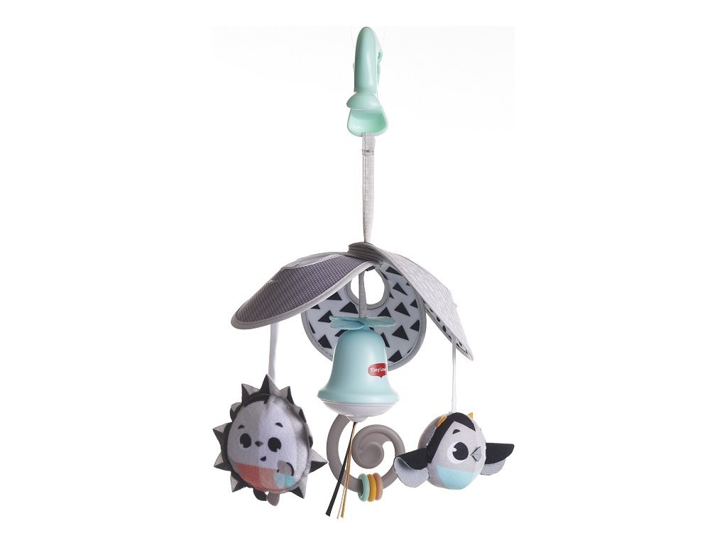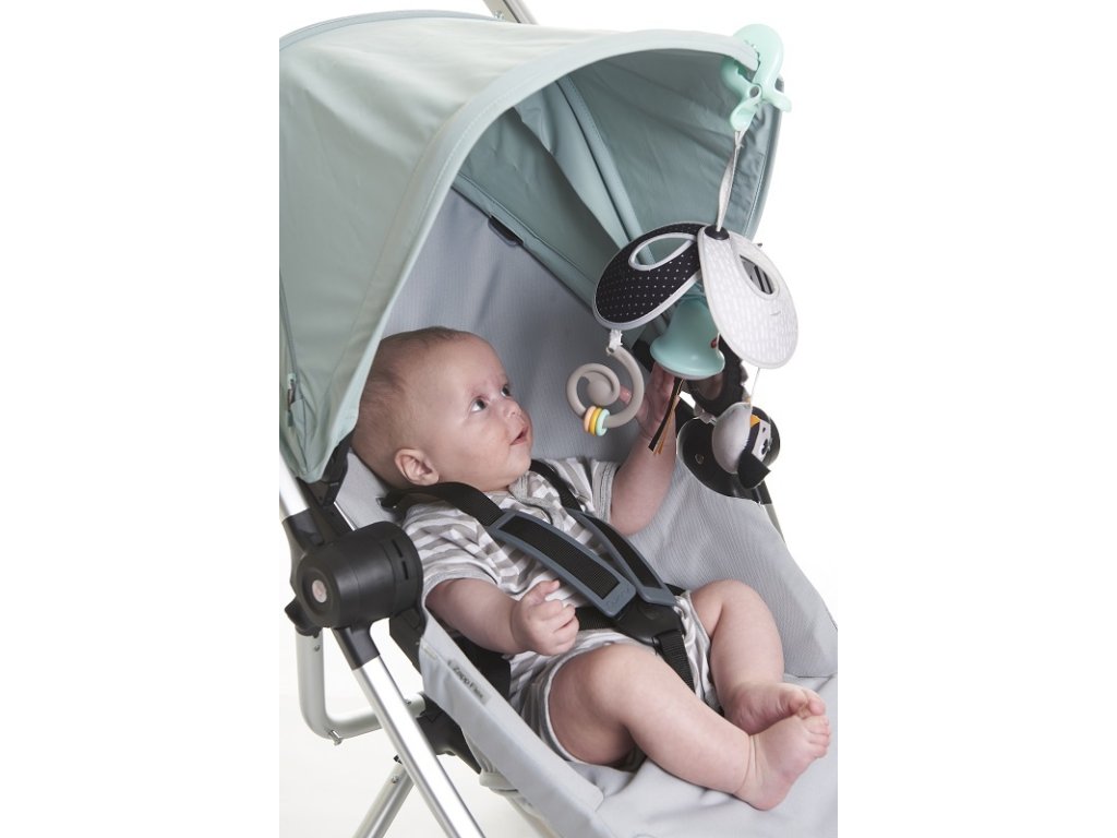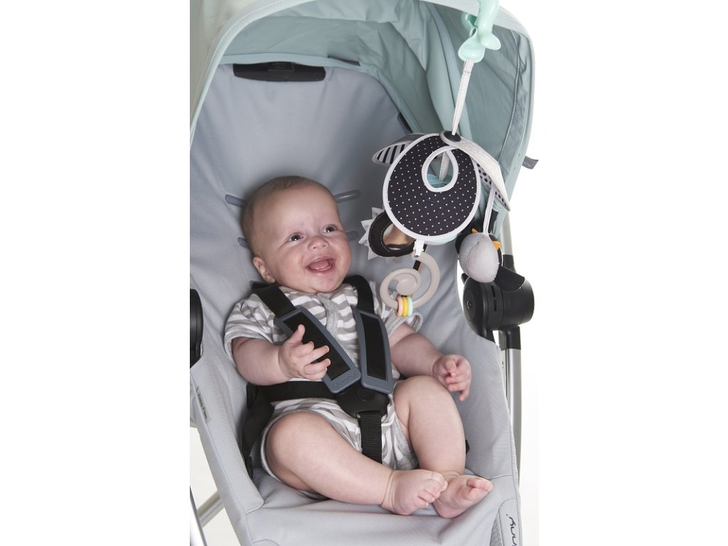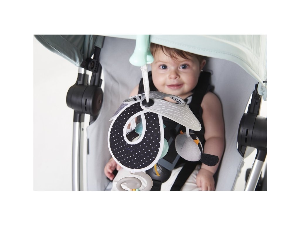 Závěsná hračka Tiny Love zajistí zábavu pro vaše dítě na cestách. Díky plastovému klipu ji lze libovolně zavěsit na autosedačku, kočárek apod. Zvoneček při pohybu jemně cinká. Zavěšené hračky chrastí a šustí. Bezpečné zrcátko, výrazné barvy a různorodé tvary a textury udrží pozornost dítěte.