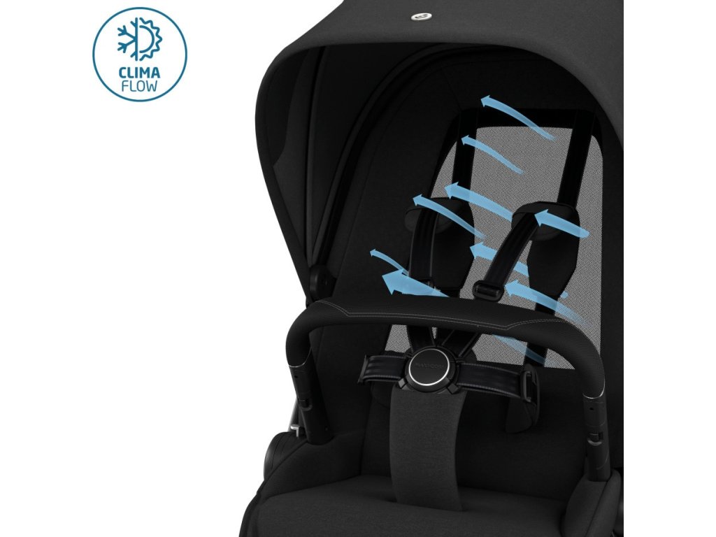 Sportovní sedák je vybaven odnímatelnou ultra polstrovanou podložkou z paměťové pěny pro maximální pohodlí dítěte při sezení i spaní. Během horkých letních dnů je možné podložku zcela vyjmout, opěrka sedáku ze síťoviny ClimaFlow maximalizuje ventilaci a pomáhá udržovat dítě v tepelném komfortu. Sedák nabízí tři polohy opěrky zad včetně rovné polohy pro přirozené spaní a pohodlnou nastavitelnou opěrku nohou. 5-bodové bezpečnostní pásy s magnetickou přezkou usnadňují poutání dítěte.