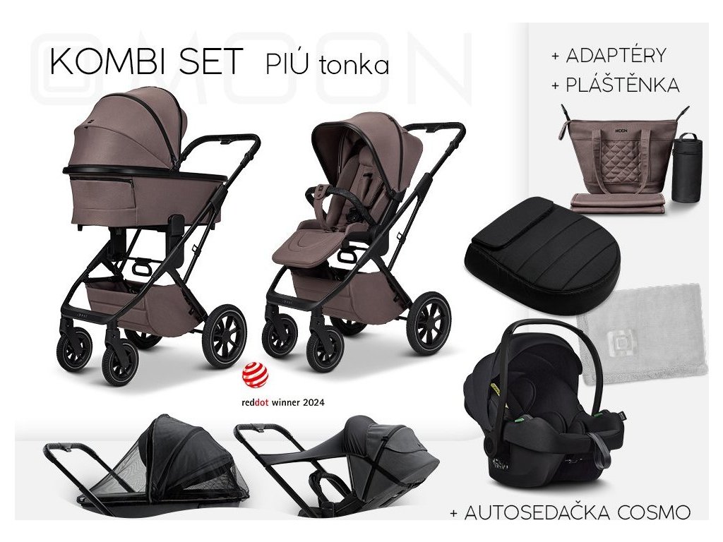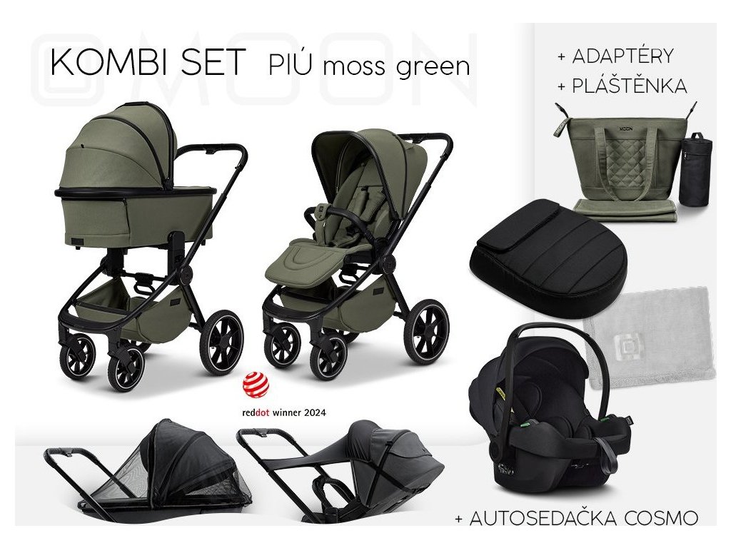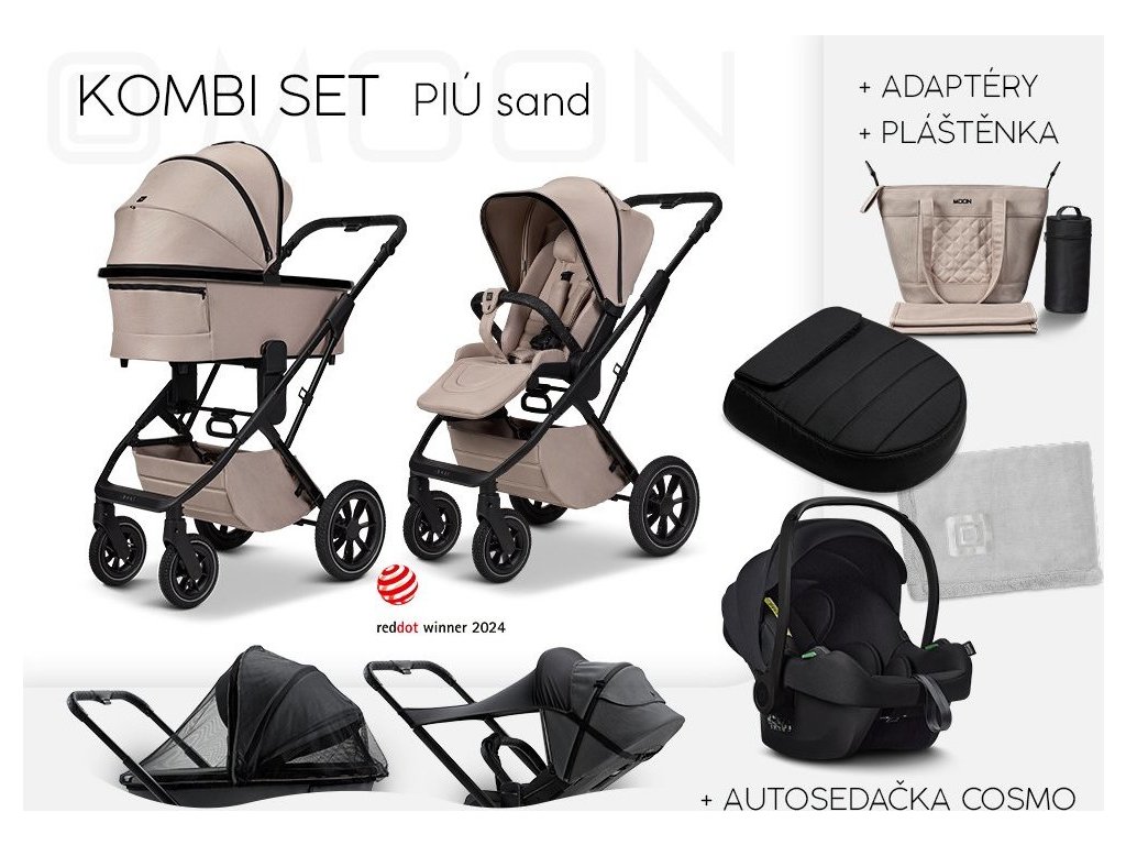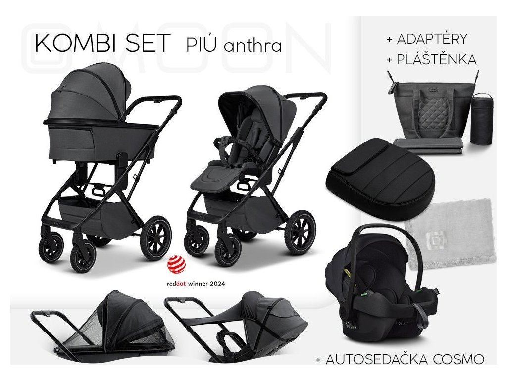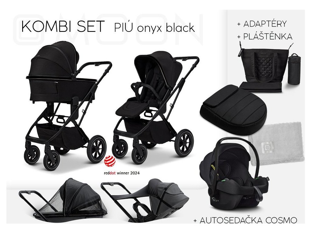 Výhodná sada Moon PIÚ KOMBI obsahuje nánožník black na sportovní verzi, autosedačku Moon COSMO Black, přebalovací tašku v barvě kočárku, moskytiéru, sluneční clonu, pláštěnku a adaptéry na autosedačku.