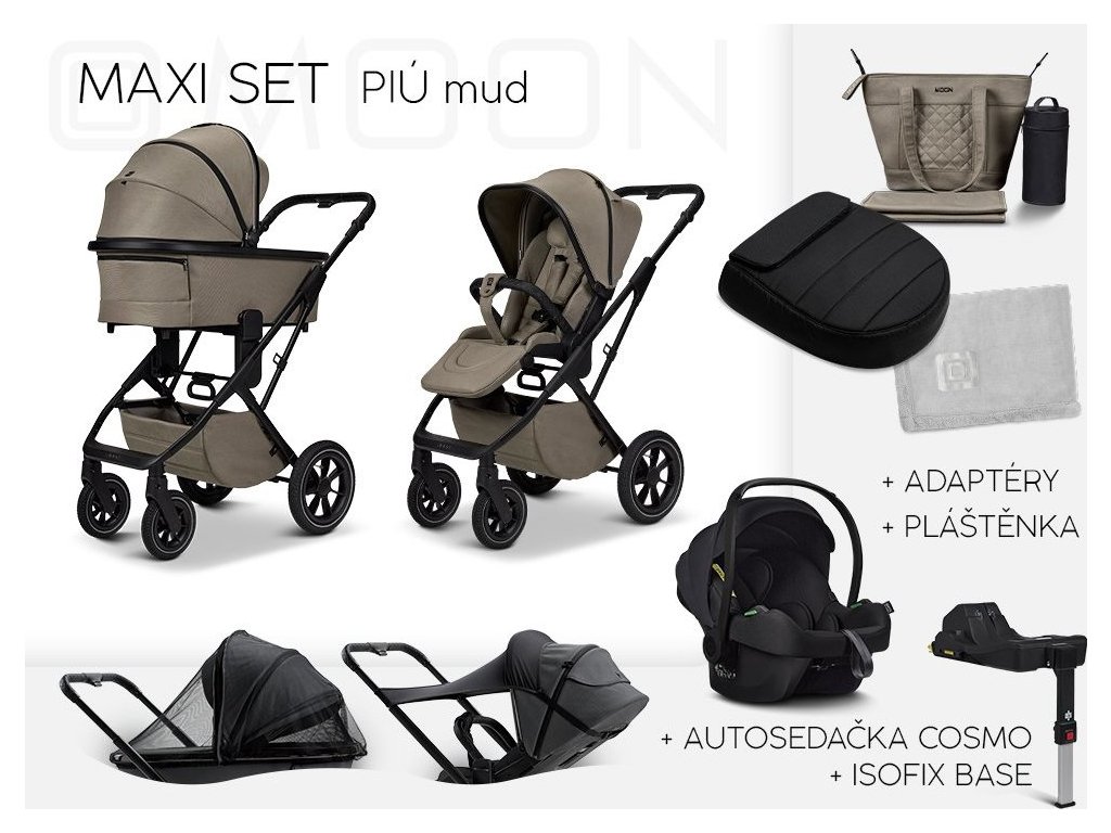 Výhodná sada Moon PIÚ MAXI obsahuje nánožník black na sportovní verzi, autosedačku Moon COSMO Black, Isofix, přebalovací tašku v barvě kočárku, moskytiéru, sluneční clonu, pláštěnku a adaptéry na autosedačku.