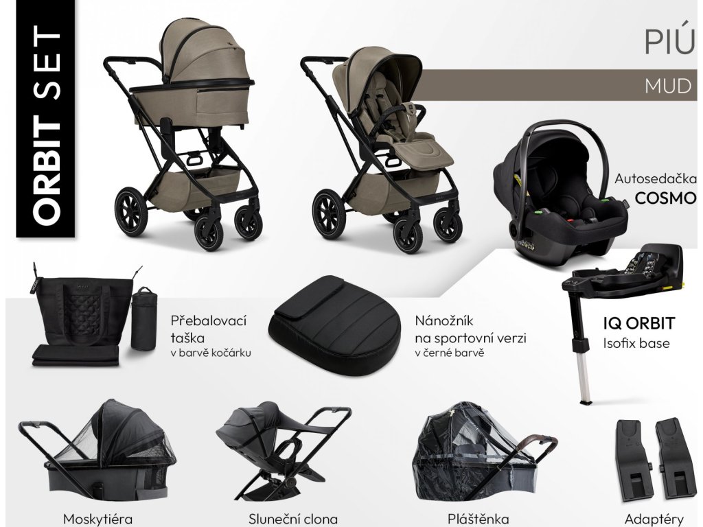 Výhodná sada Moon PIÚ ORBIT obsahuje nánožník black na sportovní verzi, autosedačku COSMO Black, Isofix IQ ORBIT, přebalovací tašku, moskytiéru, sluneční clonu, pláštěnku a adaptéry na autosedačku.