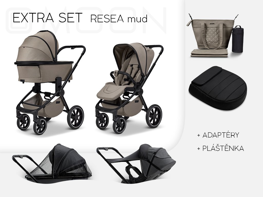 Kočárek MOON RESEA + vhodný od narození do 3 let, komfortní a lehká hluboká vana s rozepínatelnou stříškou a ventilační síťkou, hluboká vana s ventilačním odepínacím okénkem, paměťové adaptéry pro snadné vyjmutí hluboké vany, prostorný sportovní sedák s rozepínatelnou stříškou a krytou ventilační síťkou, výškově nastavitelná zádová opěrka u sportovního sedáku s odvětráváním, skládání podvozku se sportovním sedákem po i proti směru jízdy, polohovatelná opěrka zad a nohou až do úplného lehu, opěrka nohou u sportovního sedáku nemá hranu, odnímatelné madlo před dítě s koženkovým potahem, výškově nastavitelná teleskopická rukojeť s potahem z kvalitní koženky, stříška hluboké vany a sportovního sedáku s UPF 50+ ochranou, sportovní sedák nastavitelný po i proti směru jízdy, polstrované bezpečnostní pětibodové pásy, přední gumová otočná kola s možností aretace, gumová zadní kola, prostorný úložný košík.