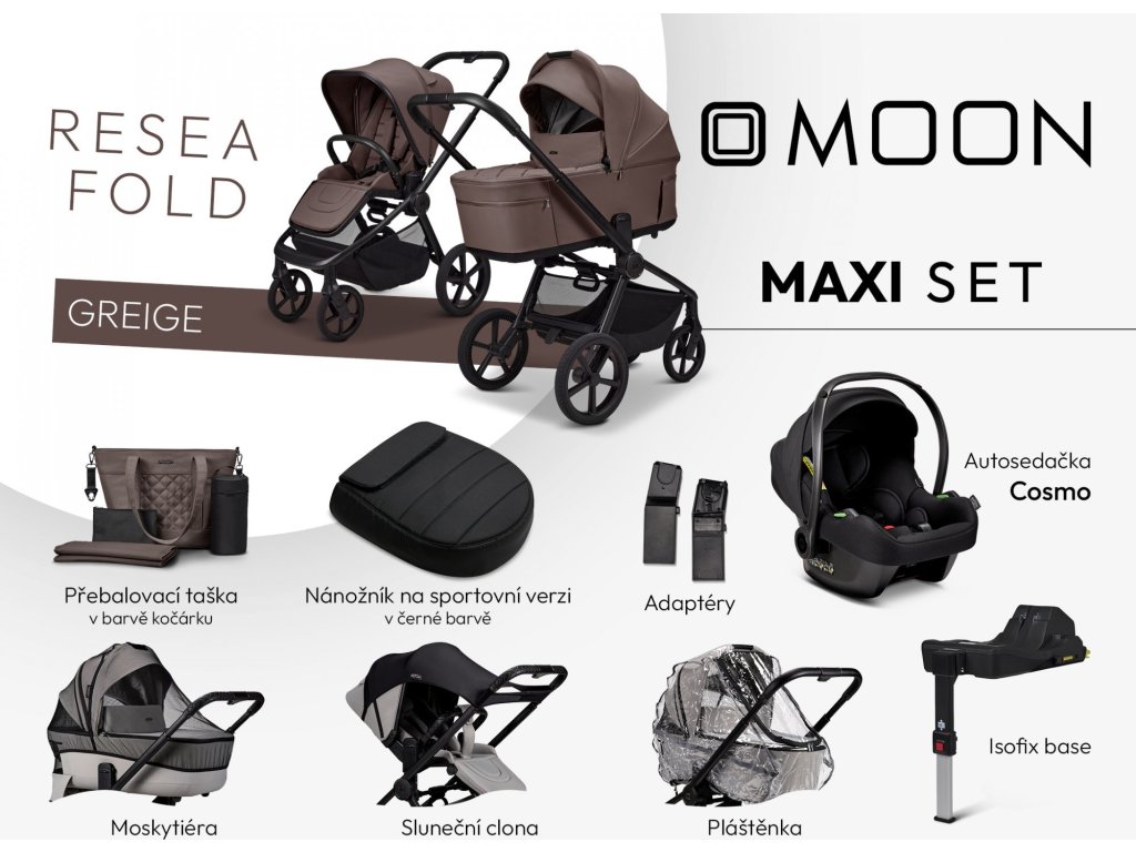 Novinka!! RESEA FOLD MAXI SET Vše potřebné pohromadě. Díky této sadě budete na každou situaci připraveni – bez nutnosti dokupovat základní výbavu zvlášť. Bohaté příslušenství v ceně: Adaptéry – pro snadné nasazení autosedačky nebo dalšího příslušenství Pláštěnka – ochrání dítě v dešti a větru Moskytiéra – perfektní na letní dny, chrání proti hmyzu Sluneční clona – zajišťuje stín a pohodlí během slunečných dnů Nánožník na sportovní sezení – ideální pro chladnější počasí Přebalovací taška v designu kočárku – praktická a stylová, s dostatkem úložného prostoru. Obsahuje přebalovací podložku, termo obal na láhev a kapsičku na drobnosti. Reflexní pásky součástí kočárku – díky reflexním páskám bude vaše dítě vždy bezpečně viditelné i při nižší viditelnosti, což je důležité pro vaši klidnou mysl při venkovních aktivitách. Autosedačka COSMO BLACK Isofix Avionaut na autosedačku Cosmo Barva zobrazeného produktu se může lišit od originálu.