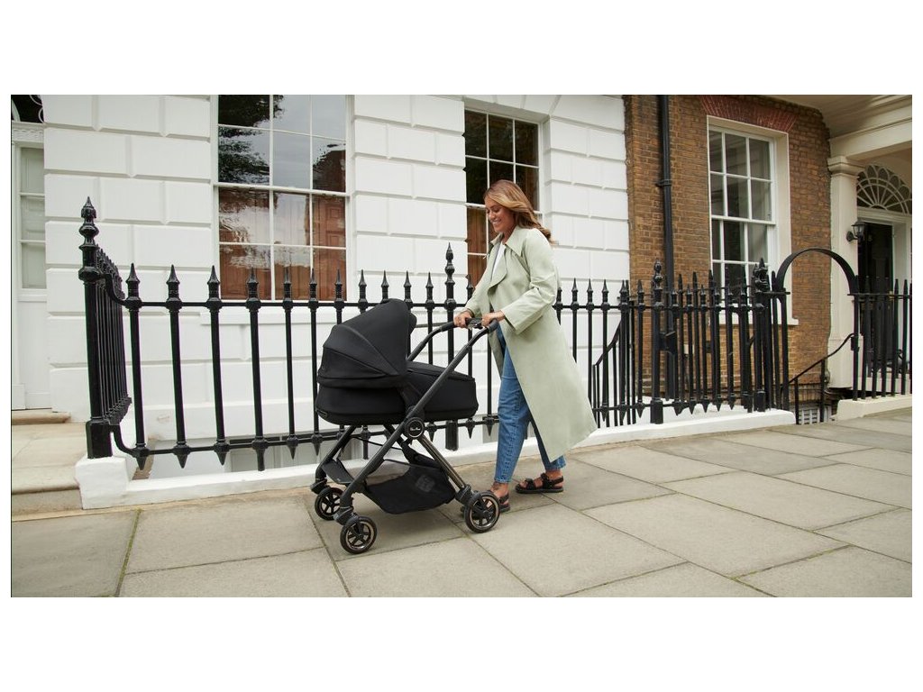 Kočárek včetně sedáku během několika sekund složíte jednou rukou. Po složení stojí samostatně na kolech bez toho, že by se rukojeť potažená umělou kůží dotýkala podlahy.
