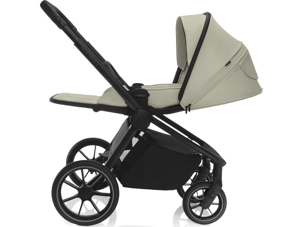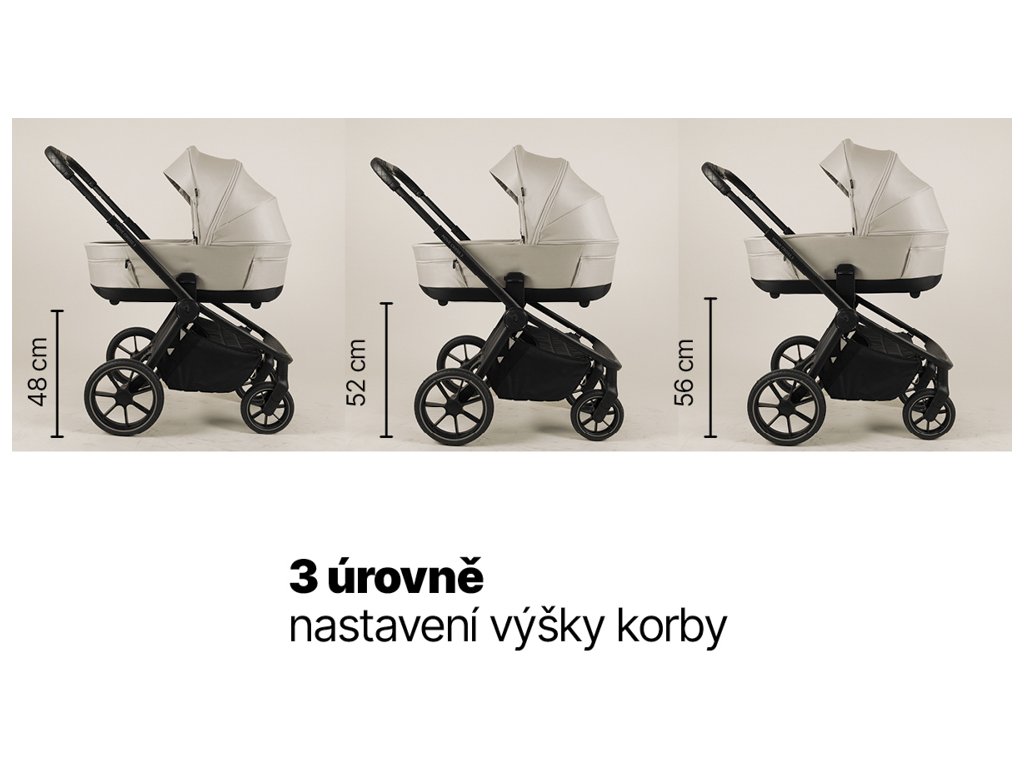 Díky třístupňovému nastavení výšky korby (48–56 cm) si každý rodič může zvolit ideální pozici dle své výšky a pohodlí. K tomu se přidávají nožičky na spodní části korby, které chrání textilii před ušpiněním při položení na zem.