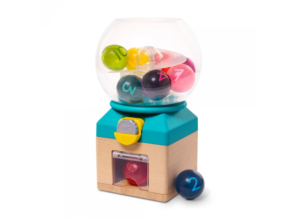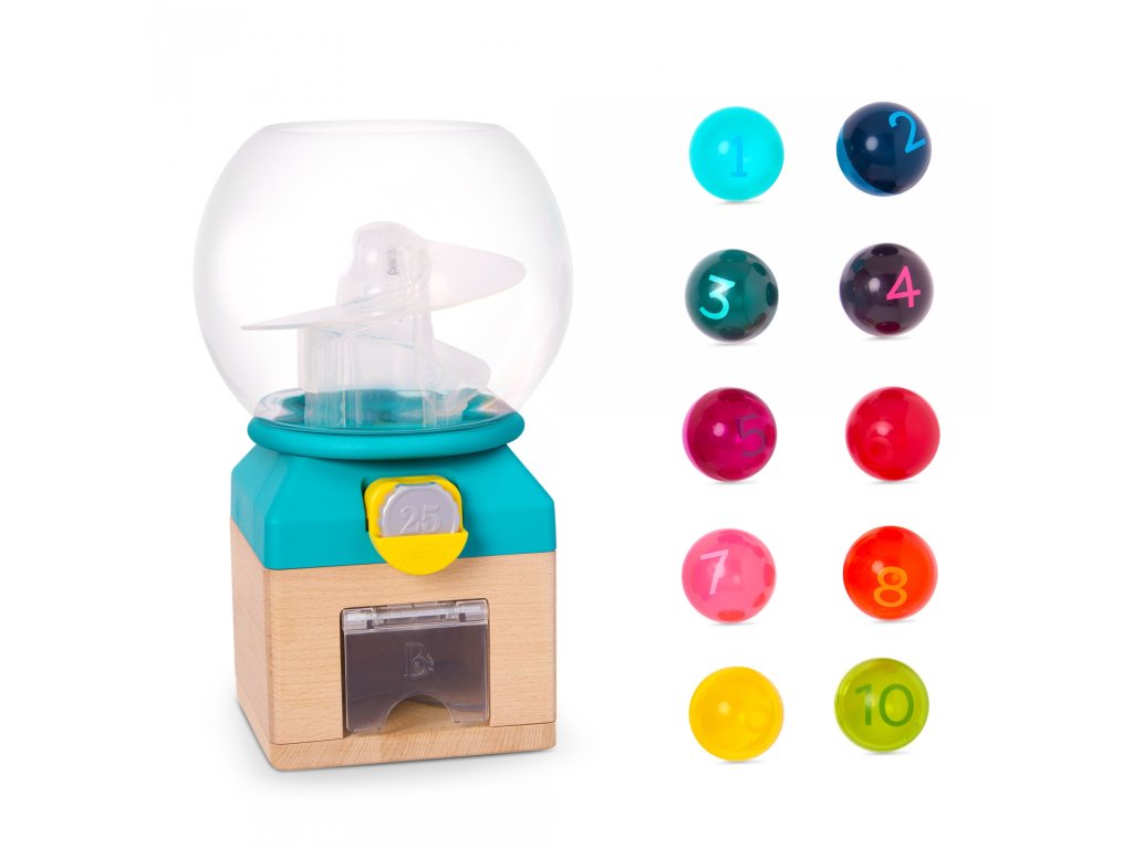 Zábava, barvy a učení v jednom! Stylový retro automat na „žvýkačky“ od B. Toys promění každé hraní v dobrodružství s čísly. Naplňte průhlednou kouli 10 barevnými míčky a stiskněte minci – překvapení je na světě! Děti budou nadšeně sledovat, jak míčky vyjíždějí ven po točité rampě, a při tom se naučí poznávat barvy i čísla od 1 do 10. Pevná dřevěná základna zajišťuje stabilitu a elegantní vzhled – hračka je tak i krásným doplňkem dětského pokoje.