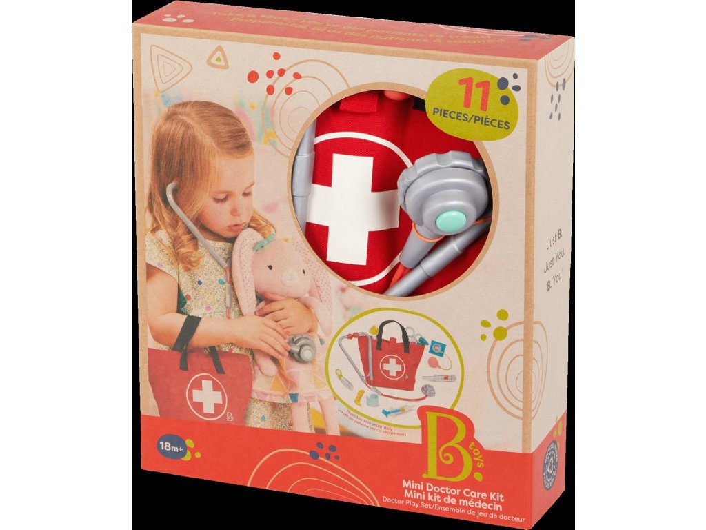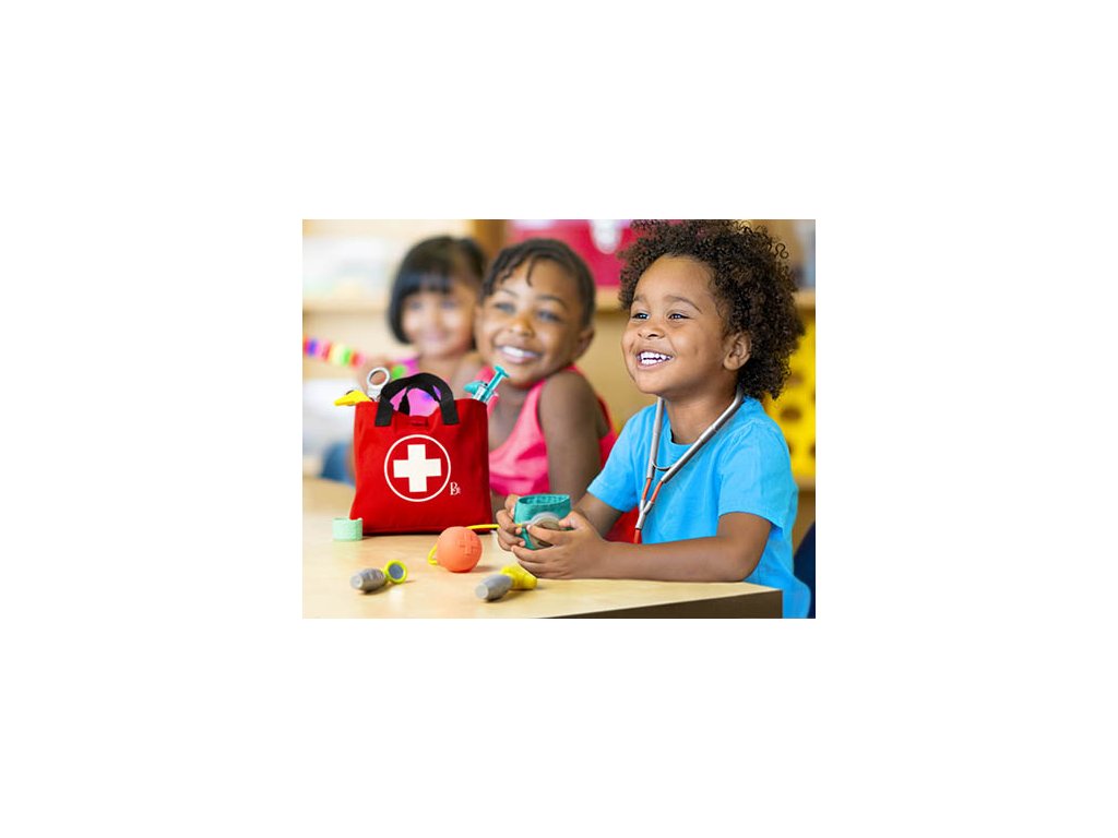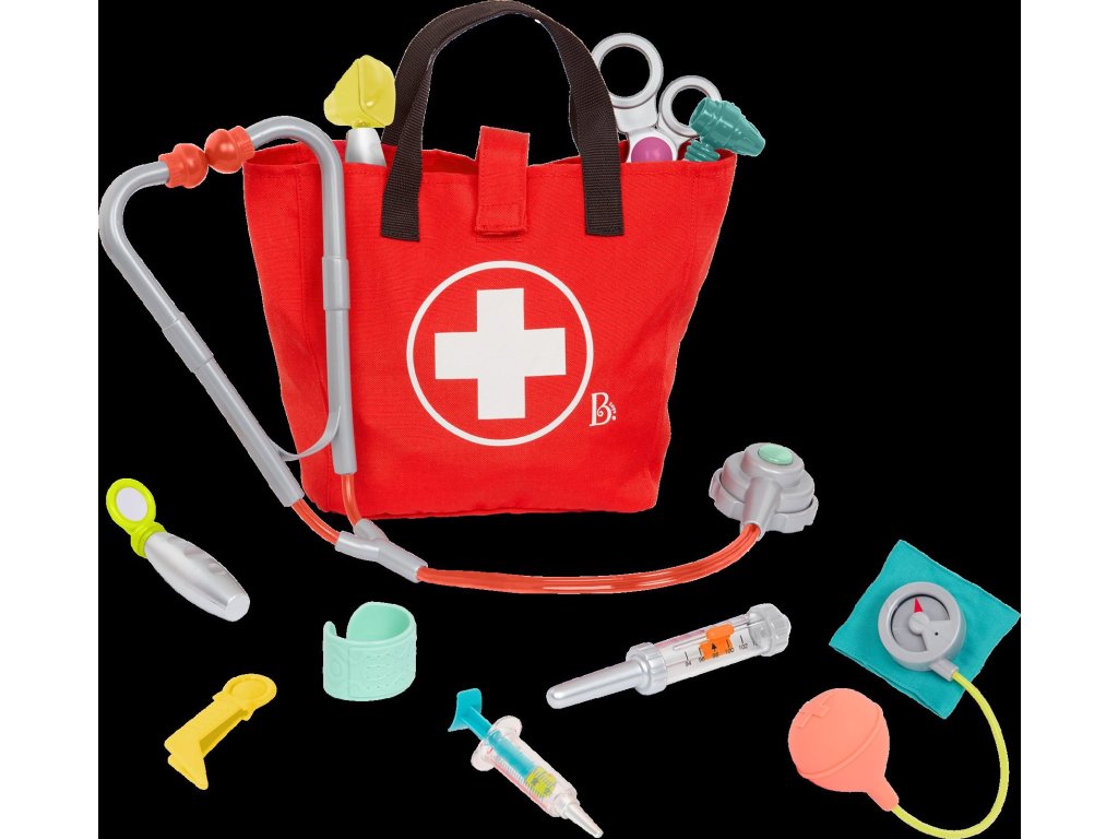 Oblíbená hra na doktora může začít! Vše, co malý lékař nebo lékařka potřebují, najdou v pevném tašce s uchem na přenášení. Sada obsahuje otoskop, teploměr, stetoskop, tlakoměr, pinzetu, stříkačku, zrcátko, obvaz, bezpečné nůžky a kladívko.