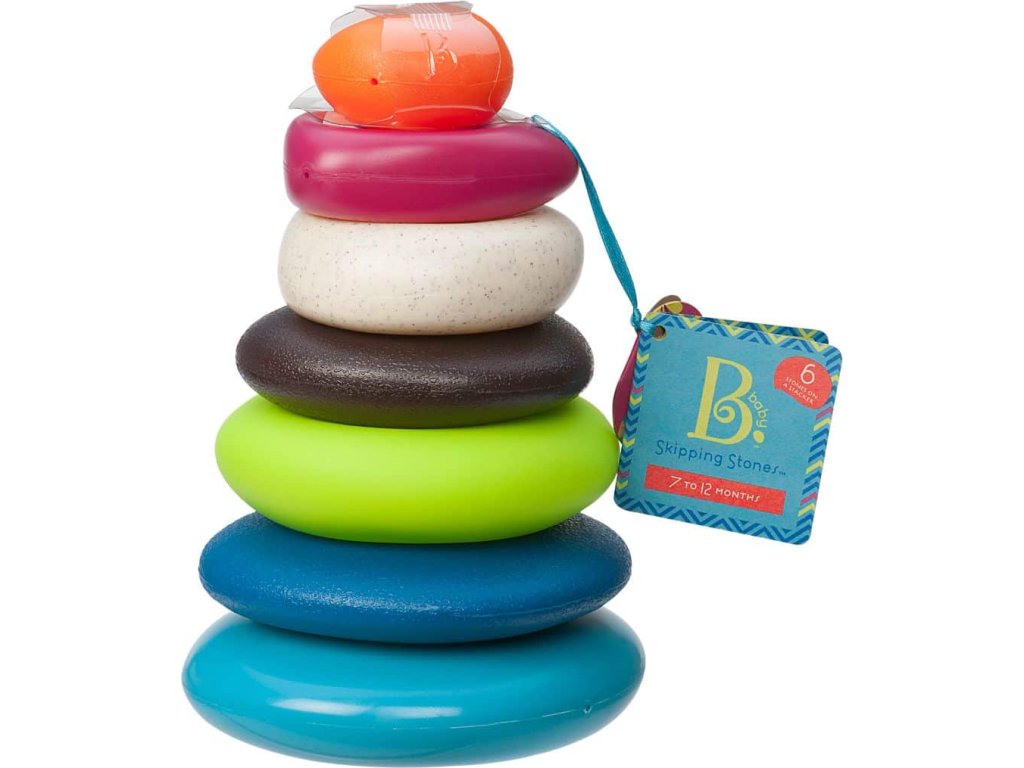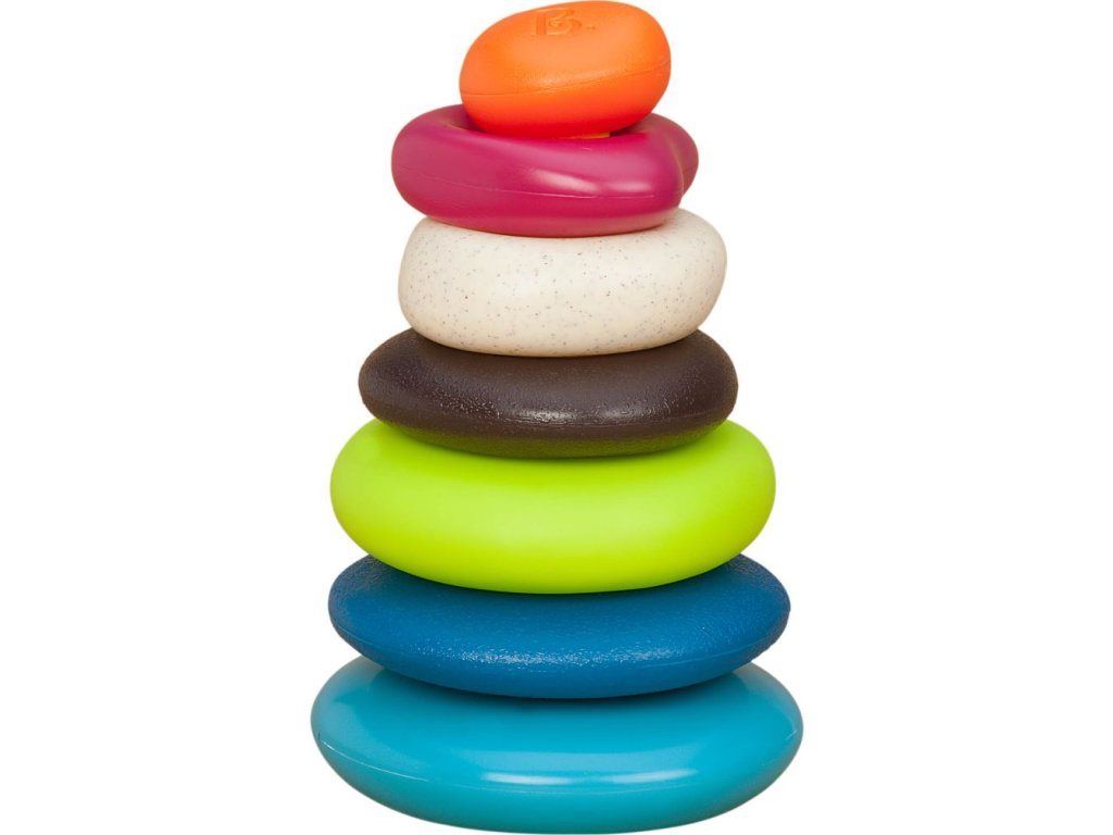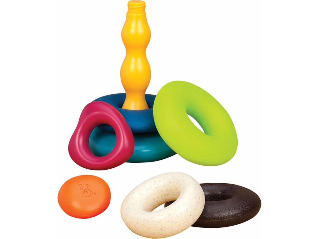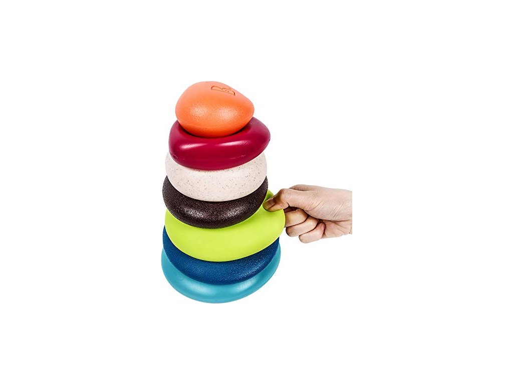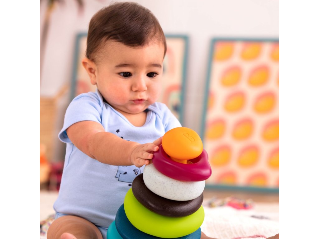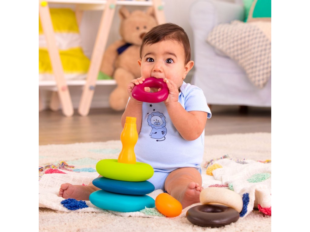 Klasická hračka v originálním provedení obsahuje kroužky přírodou inspirovaných nepravidelných tvarů. Kroužky vyrobené z různých materiálů nabízí různé barvy a textury, které lákají dítě ke zkoumání rukama i v ústech. Zelený kroužek z měkkého materiálu je možné zmáčknout, základna při pohybu chrastí. Kroužky je možné navlékat na základnu, skládat na sebe, házet si s nimi, cokoli vás a vaše dítě napadne.