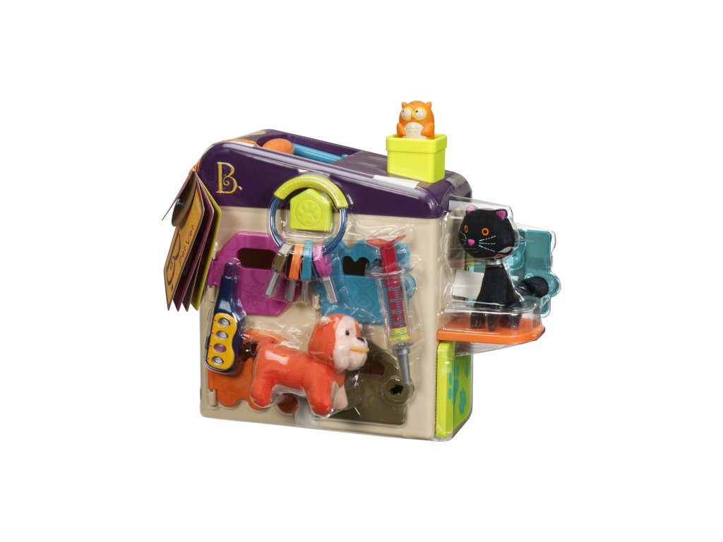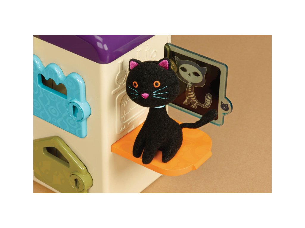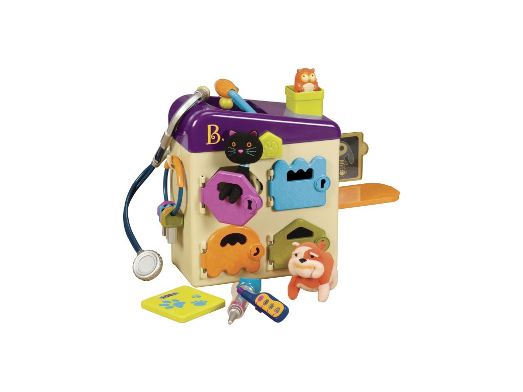 Nemocnice pro zvířátka ve tvaru kufříku má čtyři pokoje s různobarevnými dvířky a klíčky. Když chce dítě dvířka otevřít, musí vybrat klíček správné barvy. Na léčení jsou připraveni dva plyšoví pacienti – pejsek a kočička. Malý veterinář má k dispozici 4 nástroje: stetoskop, stříkačku, váhu a teploměr. Vysunovací pult usnadňuje vyšetřování malých pacientů. Z komína vykukuje sovička. Nepotřebuje baterie. Vhodné pro děti od 2 do 6 let.