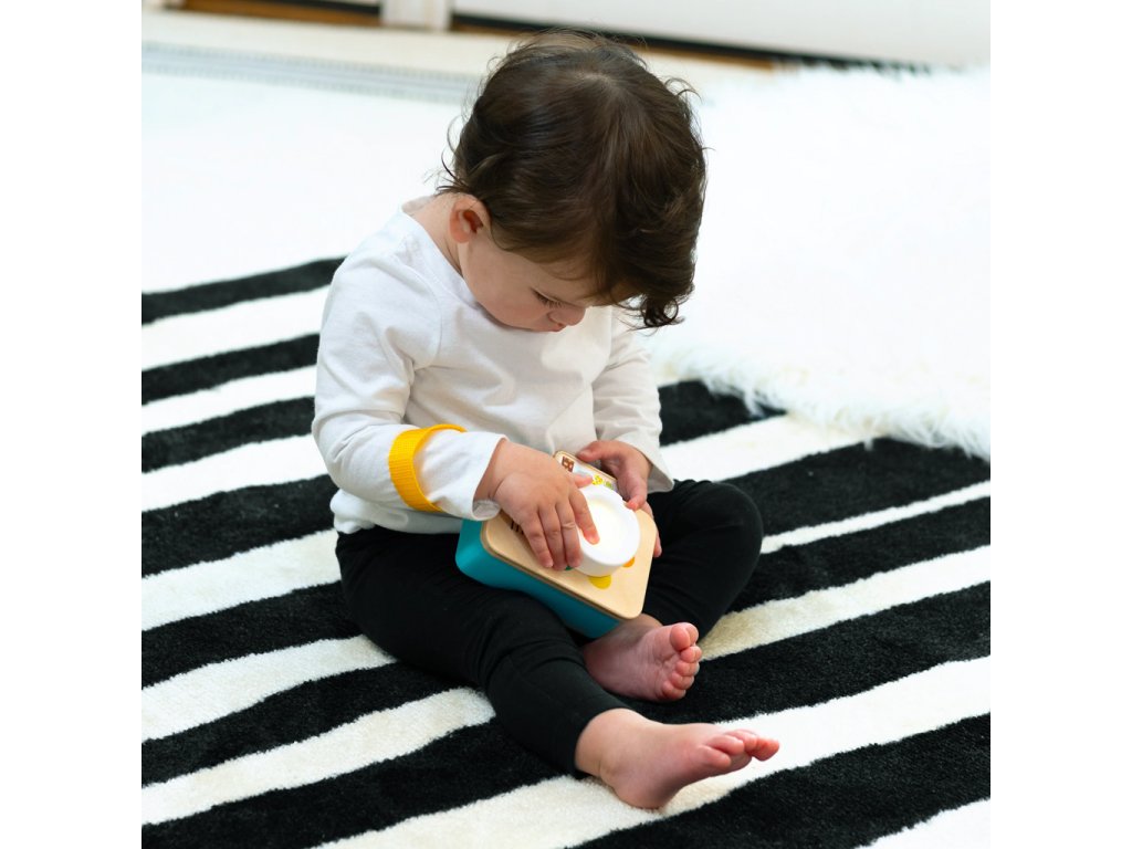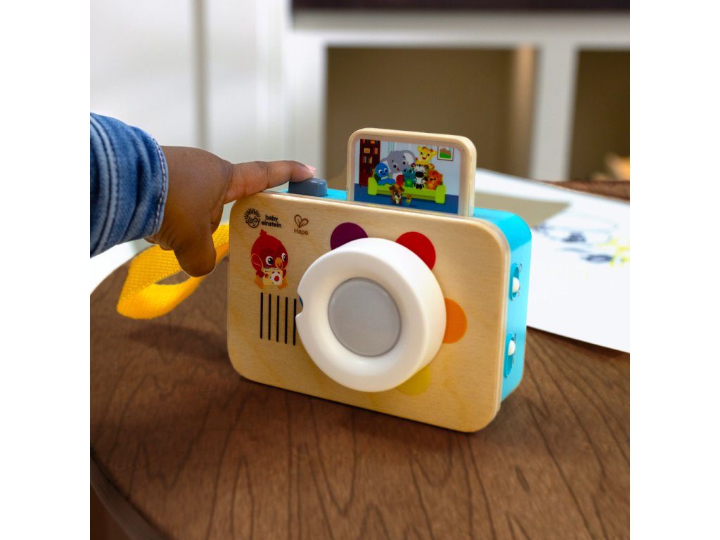 Dvě interaktivní funkce zapojují děťátko do hry a učení barev a zdokonalují příčinu a následek a jemné motorické dovednosti při každém stlačení a otočení. Otočte objektiv fotoaparátu, abyste zaostřili na učení barev. Miminko se může naučit 6 názvů barev ve 4 jazycích (angličtina, španělština, francouzština a němčina), vidět, jak se čočka rozzáří ke každé barvě, a užívat si melodie a zvuky. Stiskněte tlačítko spouště a „vyfoťte“ své oblíbené postavičky Baby Einstein! Pokaždé, když děťátko stiskne tlačítko, objeví se „fotka“ a děťátko může slyšet skutečné zvuky závěrky, aby naučilo příčinu a následek. Dřevěný povrch fotoaparátu inspirovaný Montessori s certifikací FSC a retro design děťátko snadno drží a uchopuje. Řemínek umožní vašemu malému prckovi vzít si tuto hračku na cesty a vypadat jako skutečný fotograf.