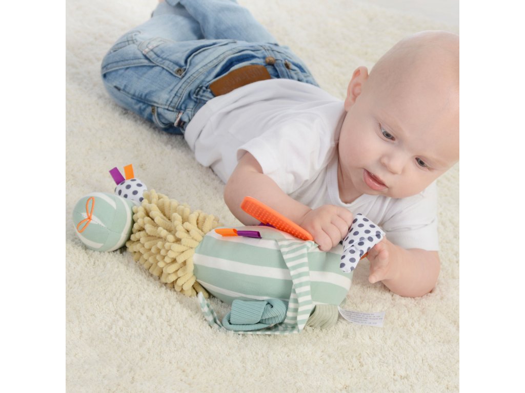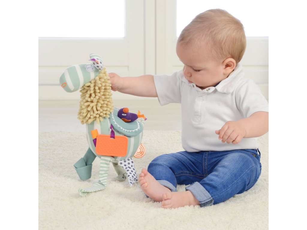 Lama je vyrobena z různých druhů textilií, které rozvíjí hmatové schopnosti. Různé aktivity zvířátka nabízí pro malé zvídavé děti skvělou zábavu a podporují správný rozvoj jemné a hrubé motoriky. Pomocí praktického kroužku je možné zvířátko zavěsit téměř kdekoliv.