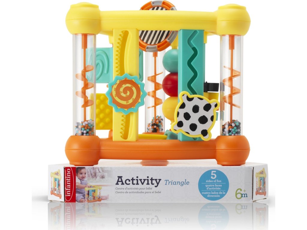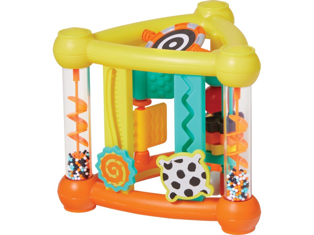 Barevný hrací pultík obsahuje množství různorodých aktivit ke zkoumání.