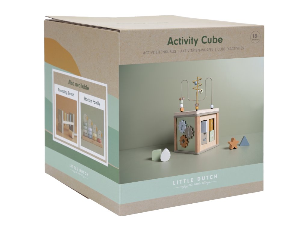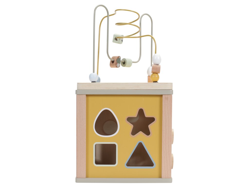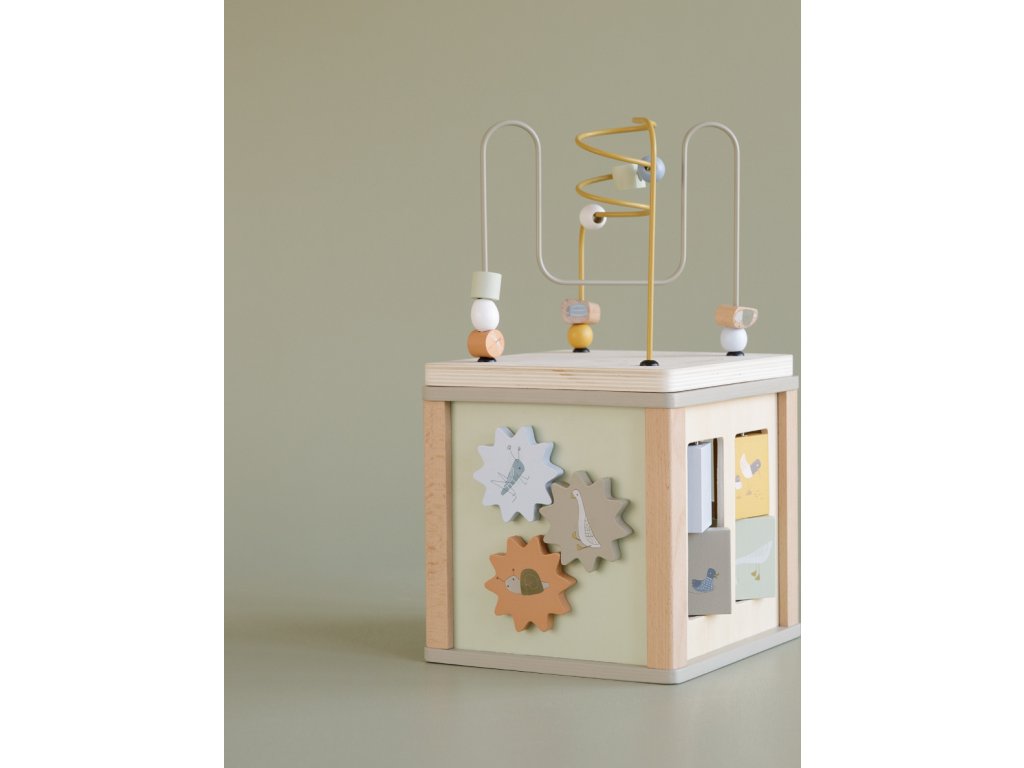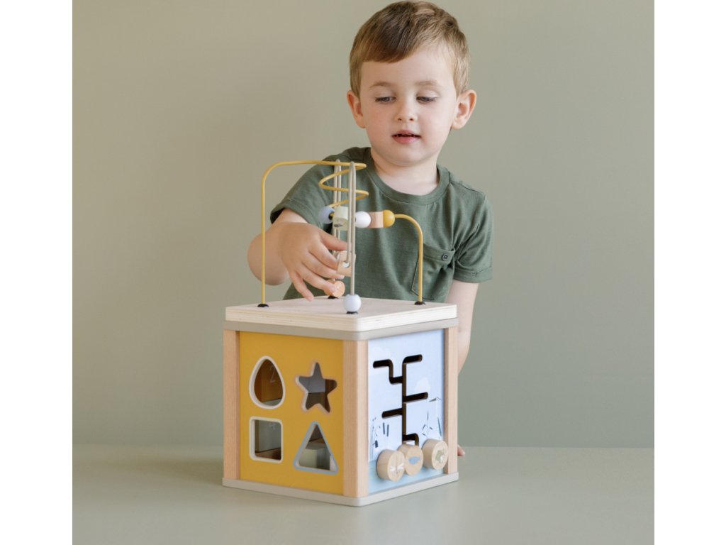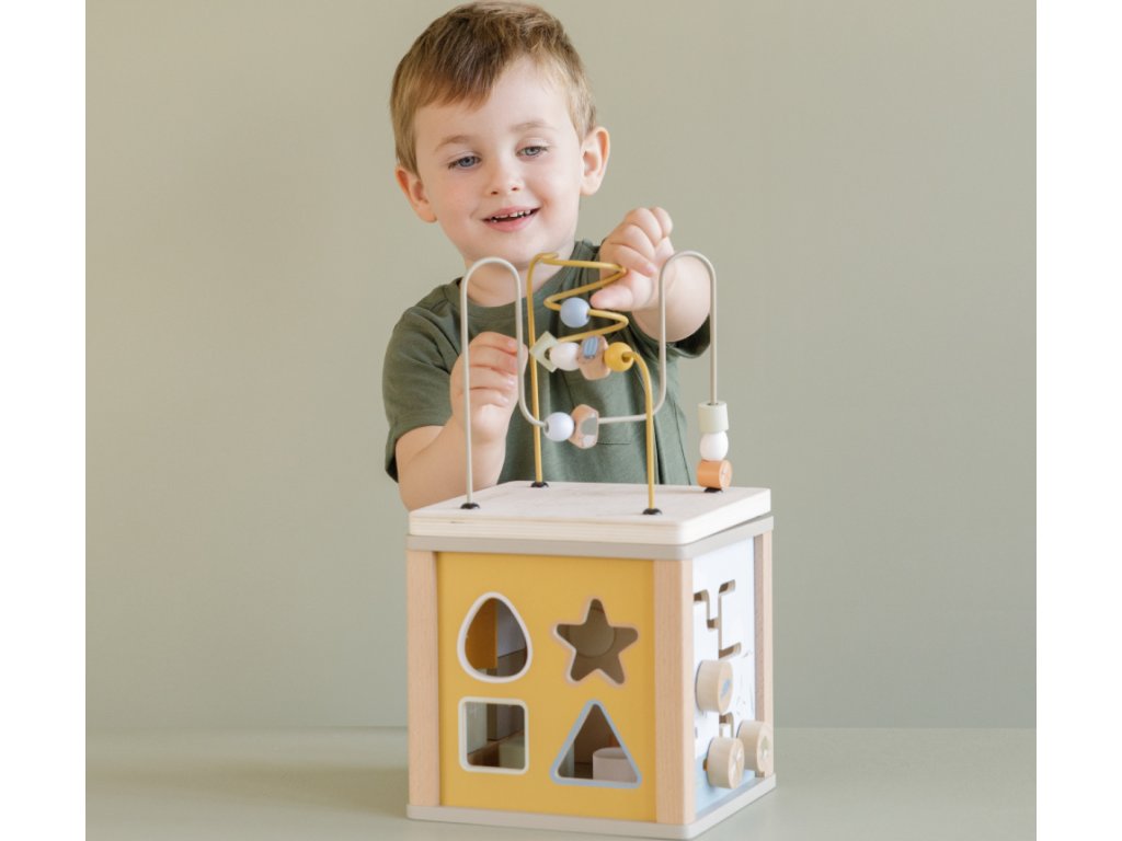 Krásná dřevěná kostka s aktivitami vzbuzuje u dětí zvědavost a poskytuje jim spoustu zábavy. Jednotlivé strany kostky obsahují nabízí různorodé aktivity - např. třídění tvarů, rotující převody, hádanky či spirály s posuvnými korálky.