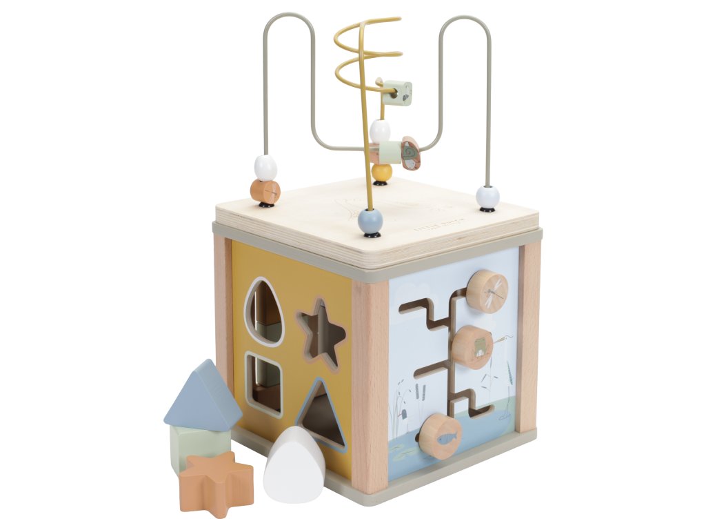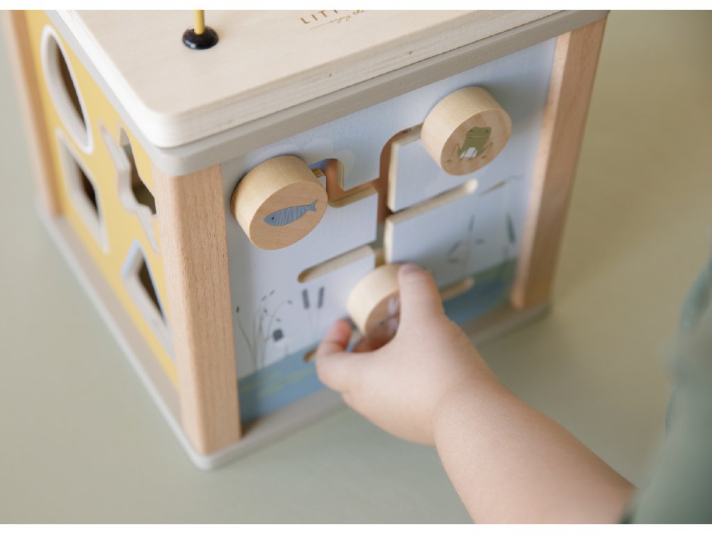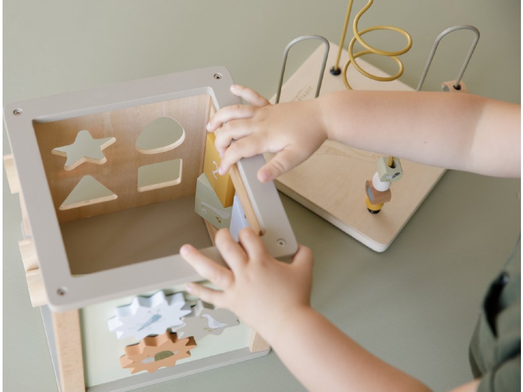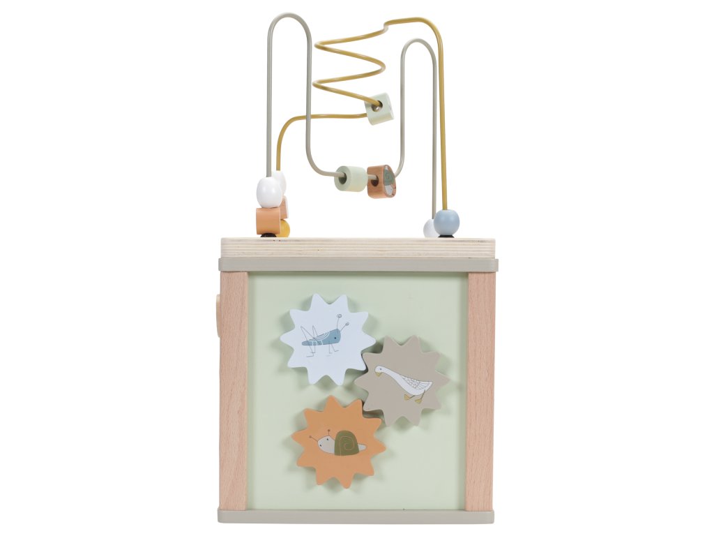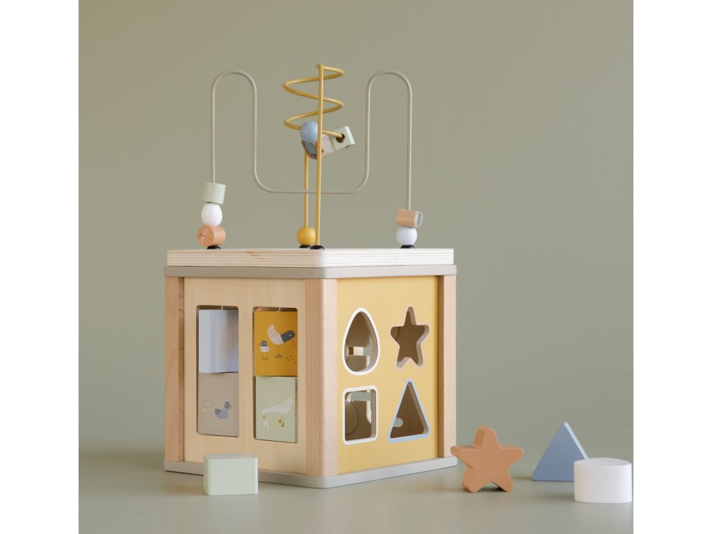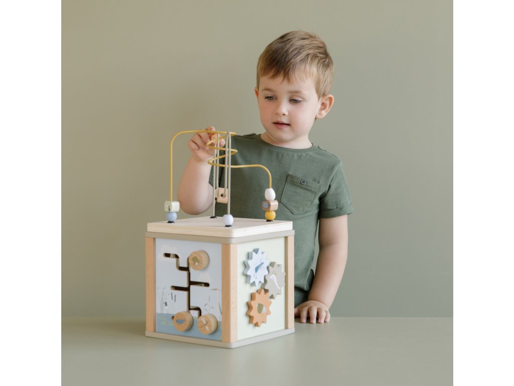 Krásná dřevěná kostka s aktivitami vzbuzuje u dětí zvědavost a poskytuje jim spoustu zábavy. Jednotlivé strany kostky obsahují nabízí různorodé aktivity - např. třídění tvarů, rotující převody, hádanky či spirály s posuvnými korálky.