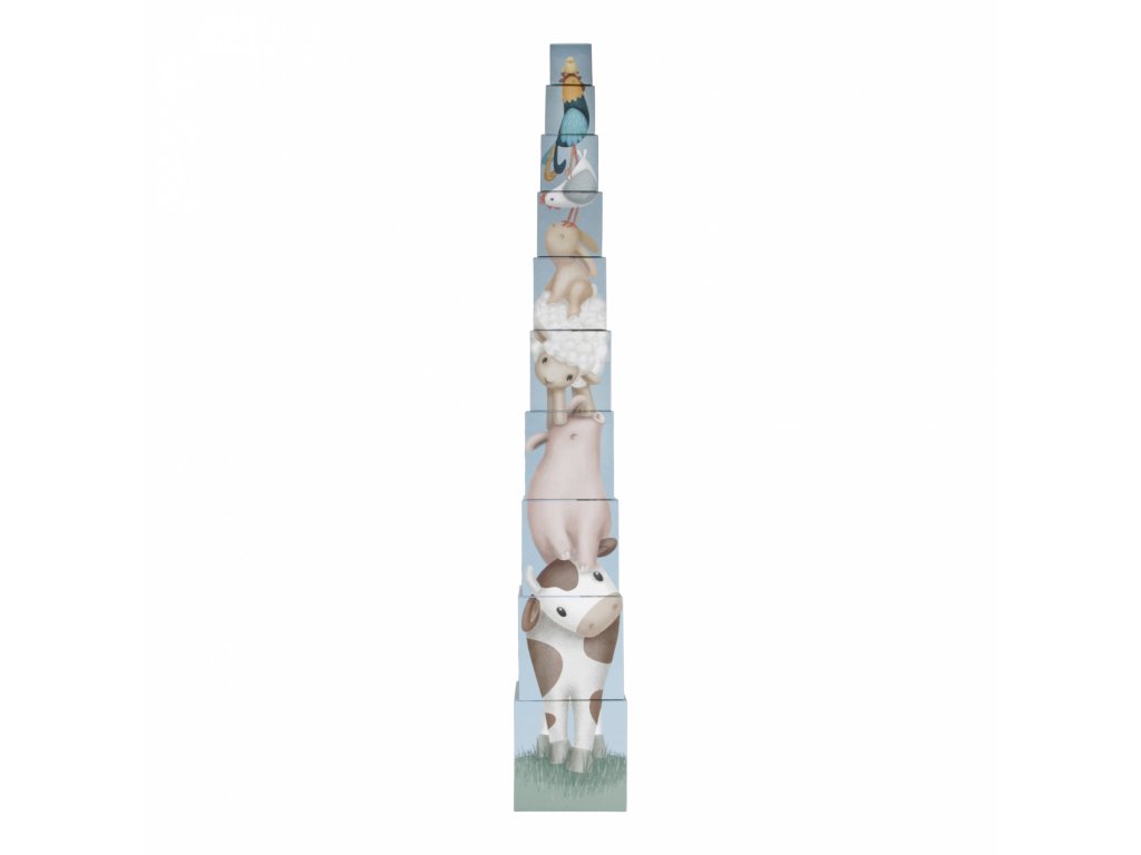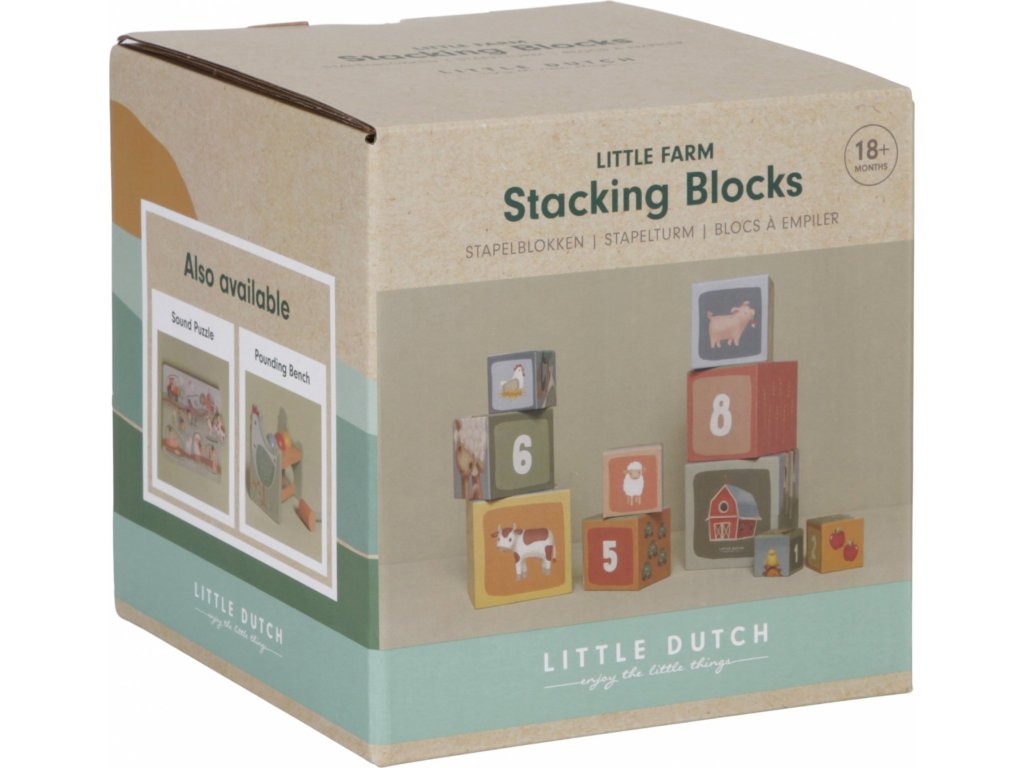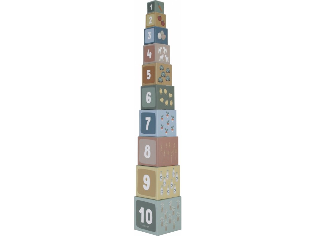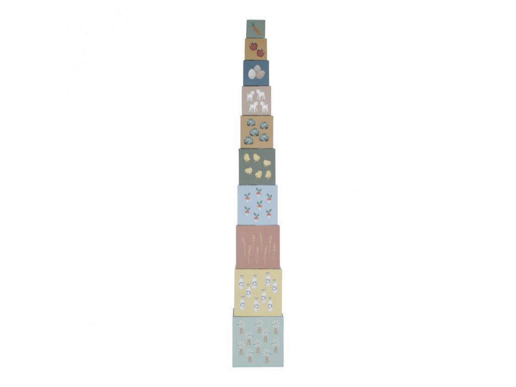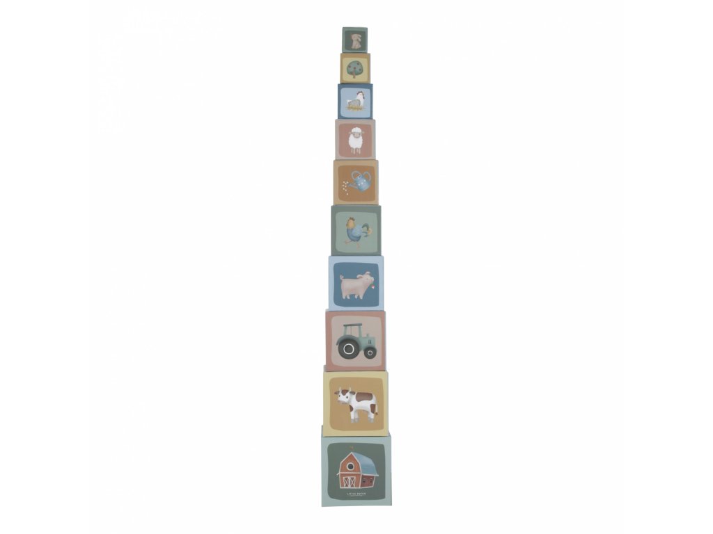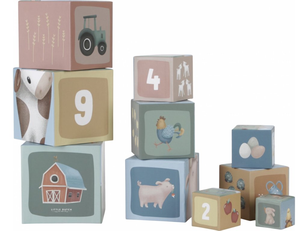 Barevné kartonové kostky s krásnými ilustracemi motivů ze života na farmě. Nechte vaše dítě kostky skládat na sebe do vysoké věže nebo vedle sebe podle velikosti. Ve starším věku se dítě s pomocí očíslovaných kostek může hravým způsobem učit počítat i rozpoznávat číslice.