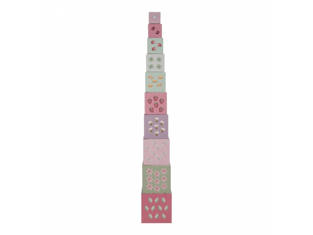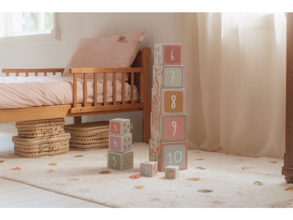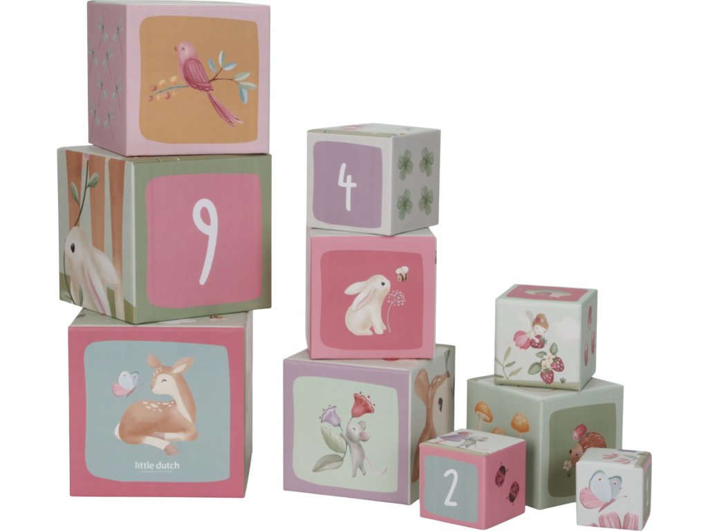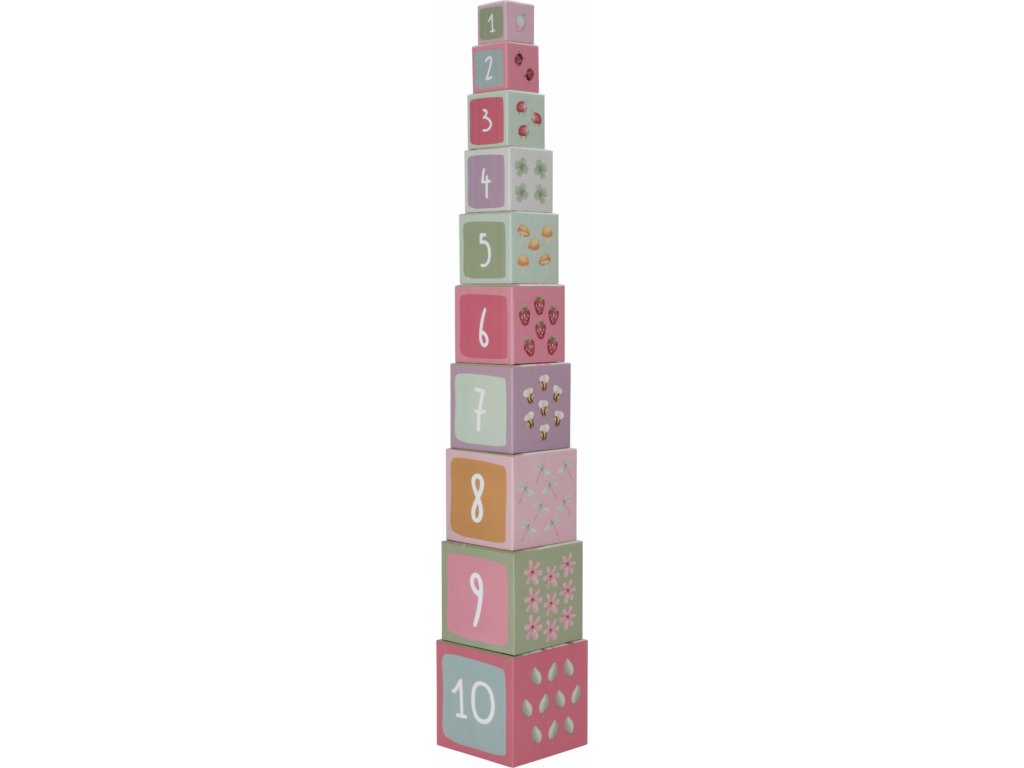 Barevné kartonové kostky s krásnými ilustracemi motivů ze života na zahradě. Nechte vaše dítě kostky skládat na sebe do vysoké věže nebo vedle sebe podle velikosti. Ve starším věku se dítě s pomocí očíslovaných kostek může hravým způsobem učit počítat i rozpoznávat číslice.