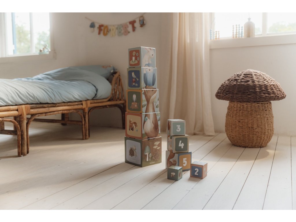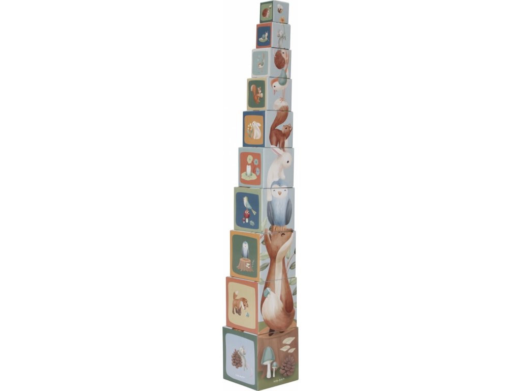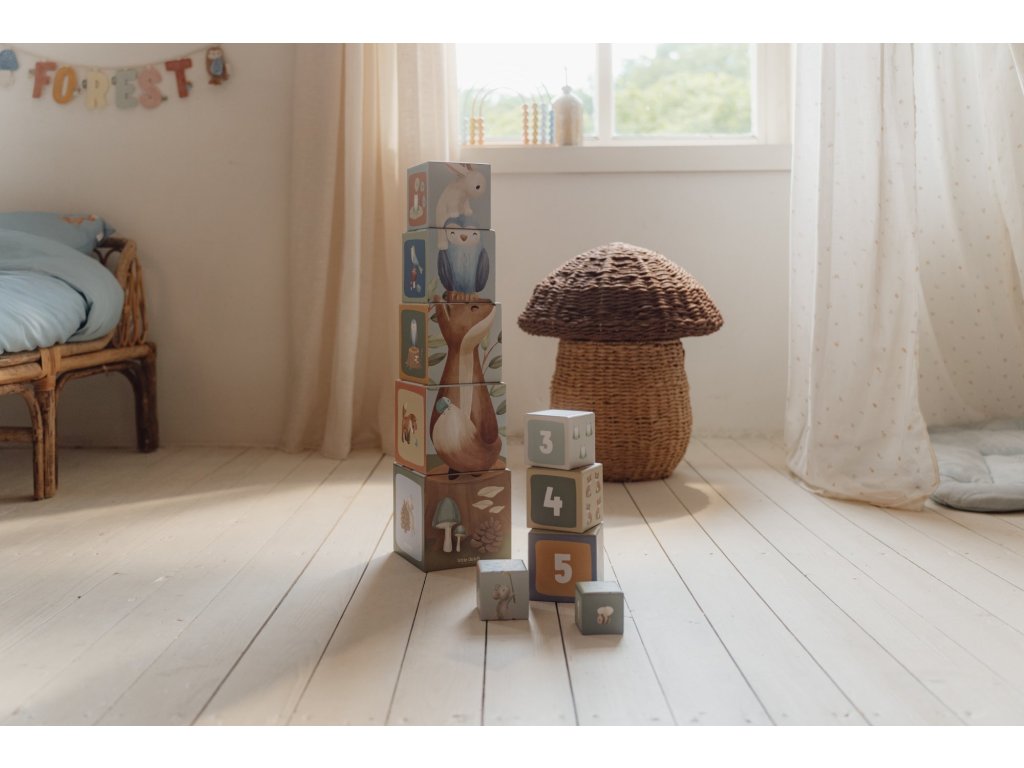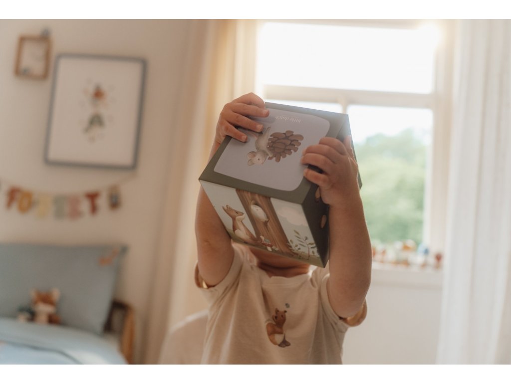 Barevné kartonové kostky s krásnými ilustracemi motivů ze života v lese. Nechte vaše dítě kostky skládat na sebe do vysoké věže nebo vedle sebe podle velikosti. Ve starším věku se dítě s pomocí očíslovaných kostek může hravým způsobem učit počítat i rozpoznávat číslice.