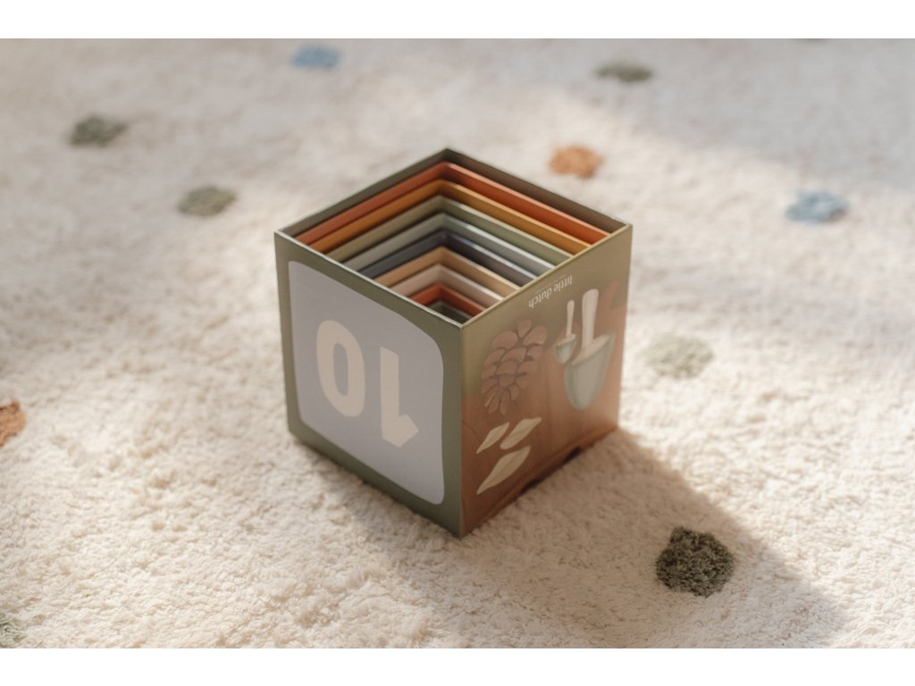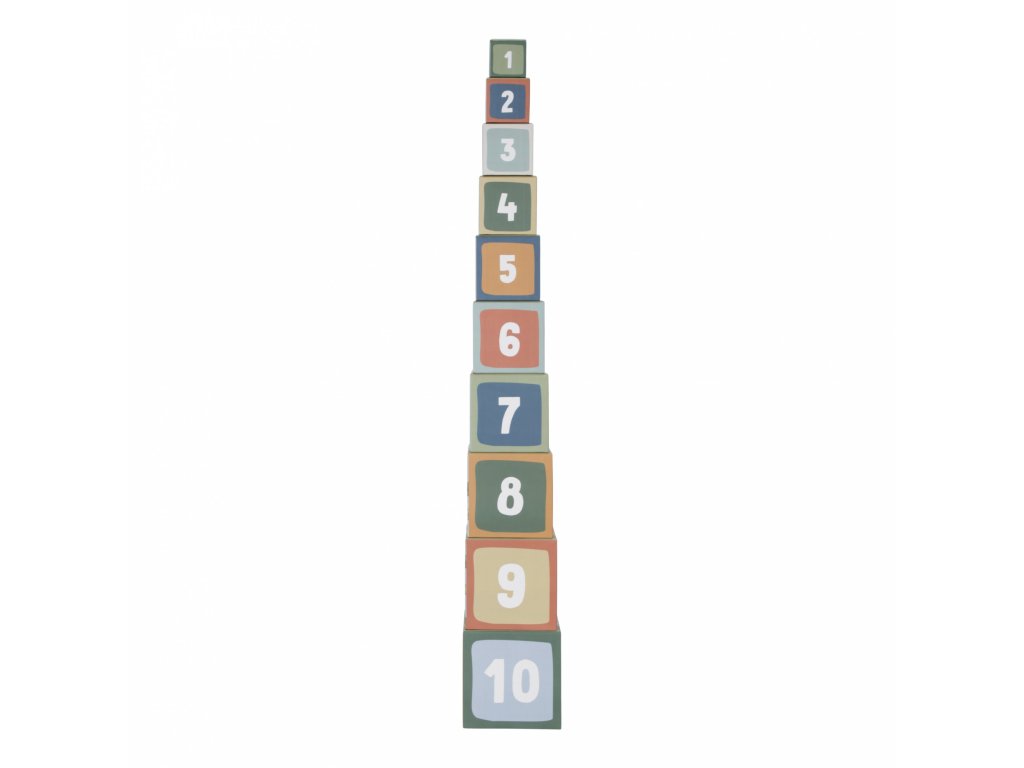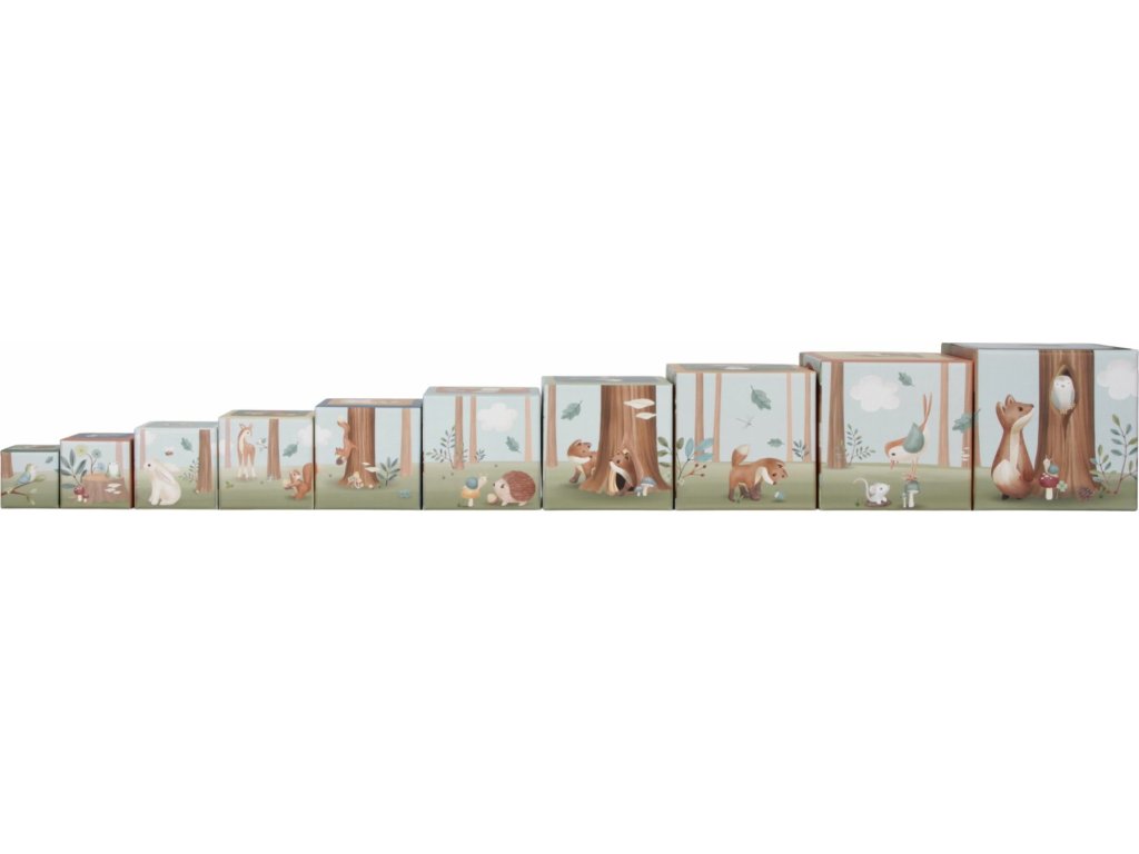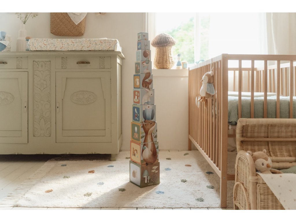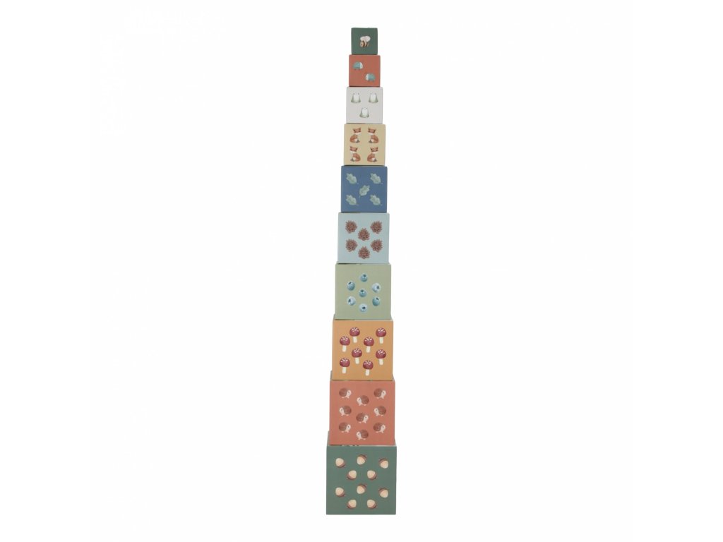 Barevné kartonové kostky s krásnými ilustracemi motivů ze života v lese. Nechte vaše dítě kostky skládat na sebe do vysoké věže nebo vedle sebe podle velikosti. Ve starším věku se dítě s pomocí očíslovaných kostek může hravým způsobem učit počítat i rozpoznávat číslice.