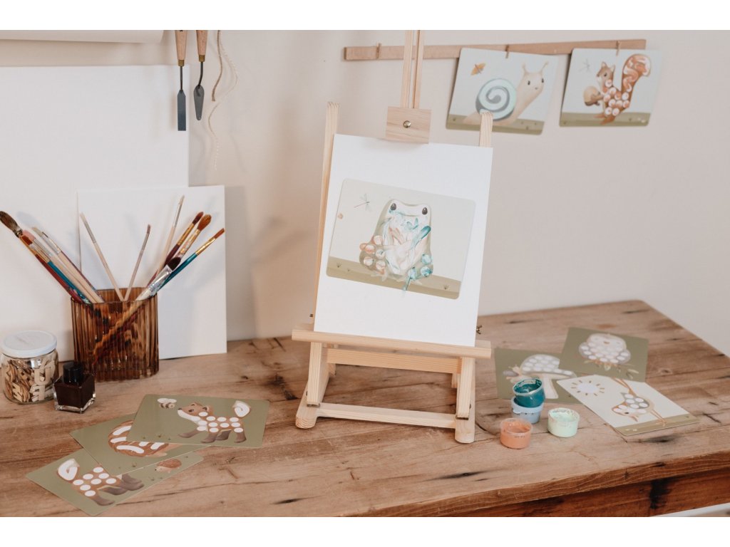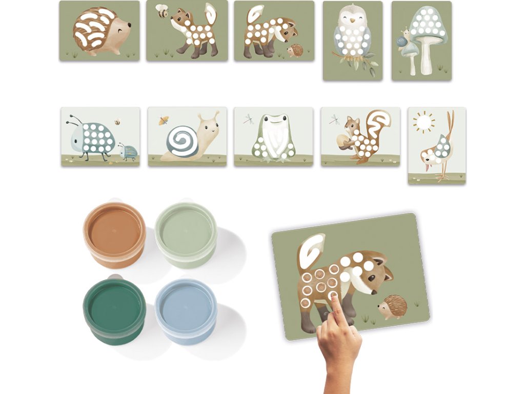 Sada pro malování prsty v krásném provedení umožní vašemu dítěti popustit uzdu své kreativitě. Sada obsahuje 4 jemné pastelové barvy a předtištěné kartičky s potiskem motivů ze života v lese. Hraní s prstvoými barvami stimuluje rozvoj jemné motoriky i kreativitu dítěte.
