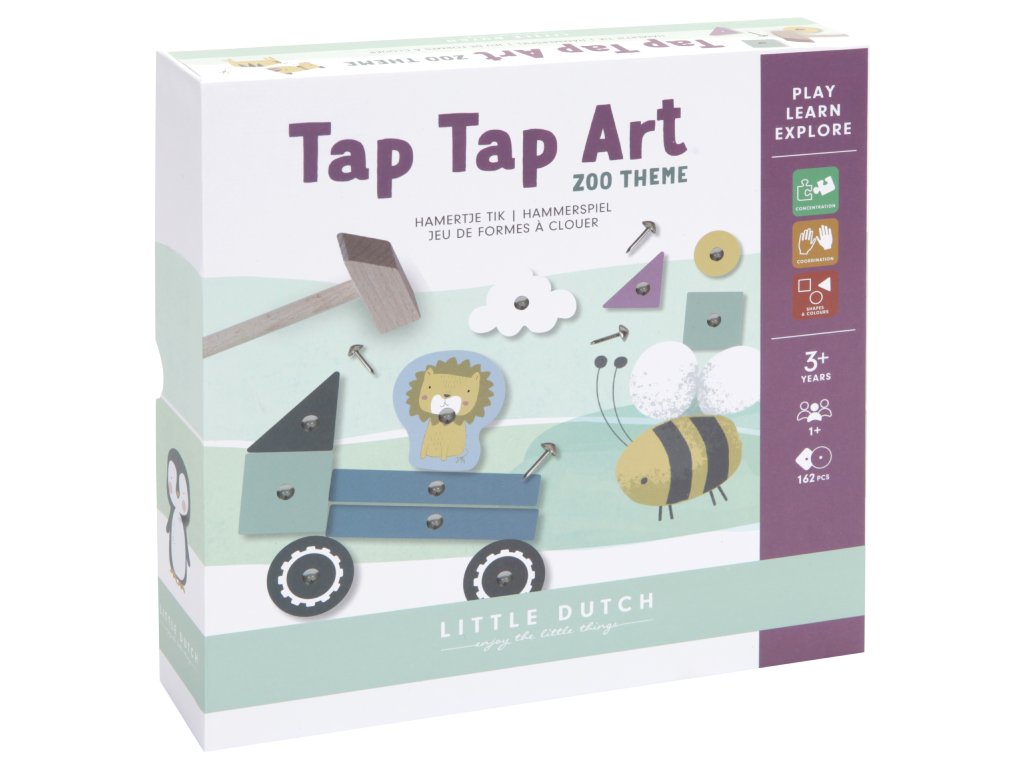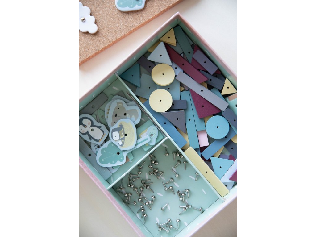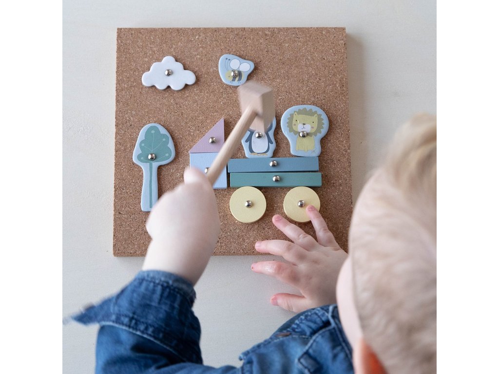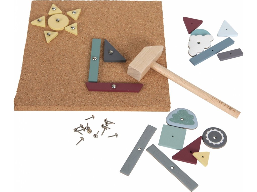 Kreativní sada umožňuje dětem popustit uzdu své fantazii a z různých geometrických tvarů vytvářet nekonečné množství obrazců. Jednotlivé tvary dítě připevňuje ke korkové desce s pomocí kladívka a hřebíků.