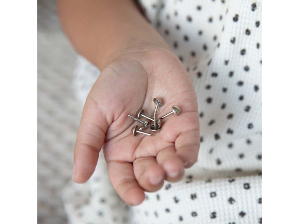 Sada obsahuje korkovou desku, dřevěné kladívko, různé dřevěné a kartonové tvary, 4 kartičky s vzorovými obrázky a 70 hřebíků.