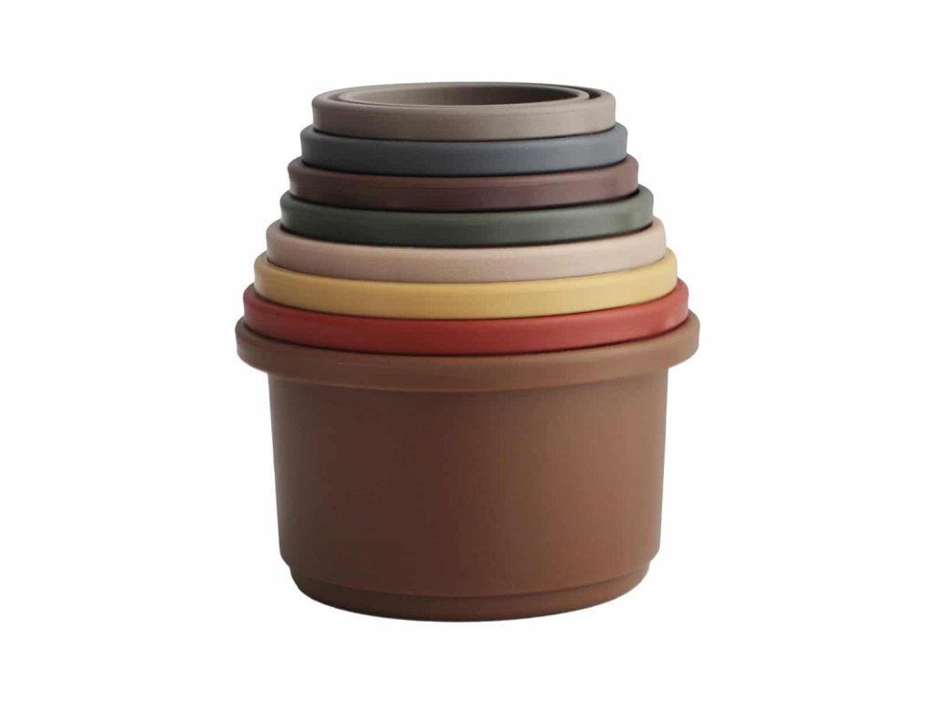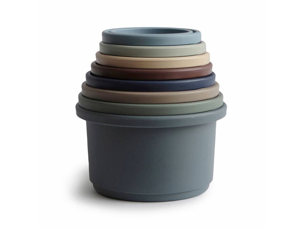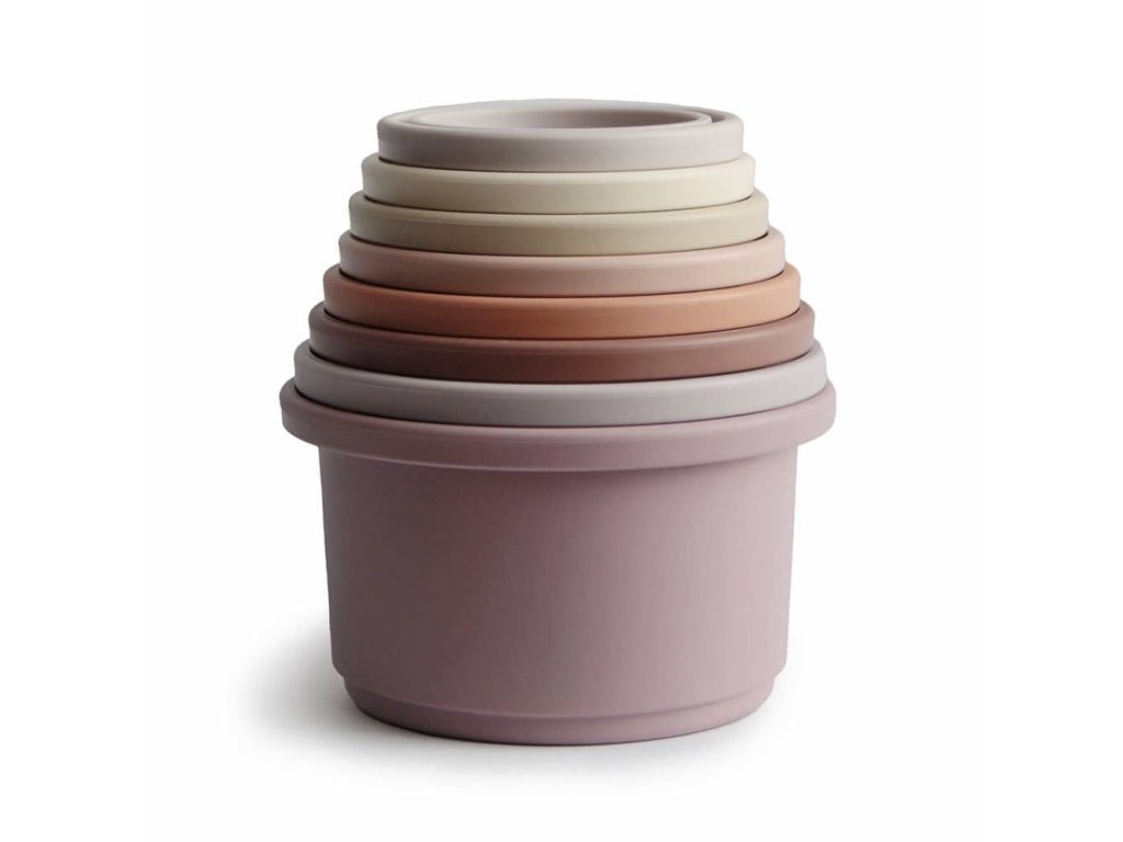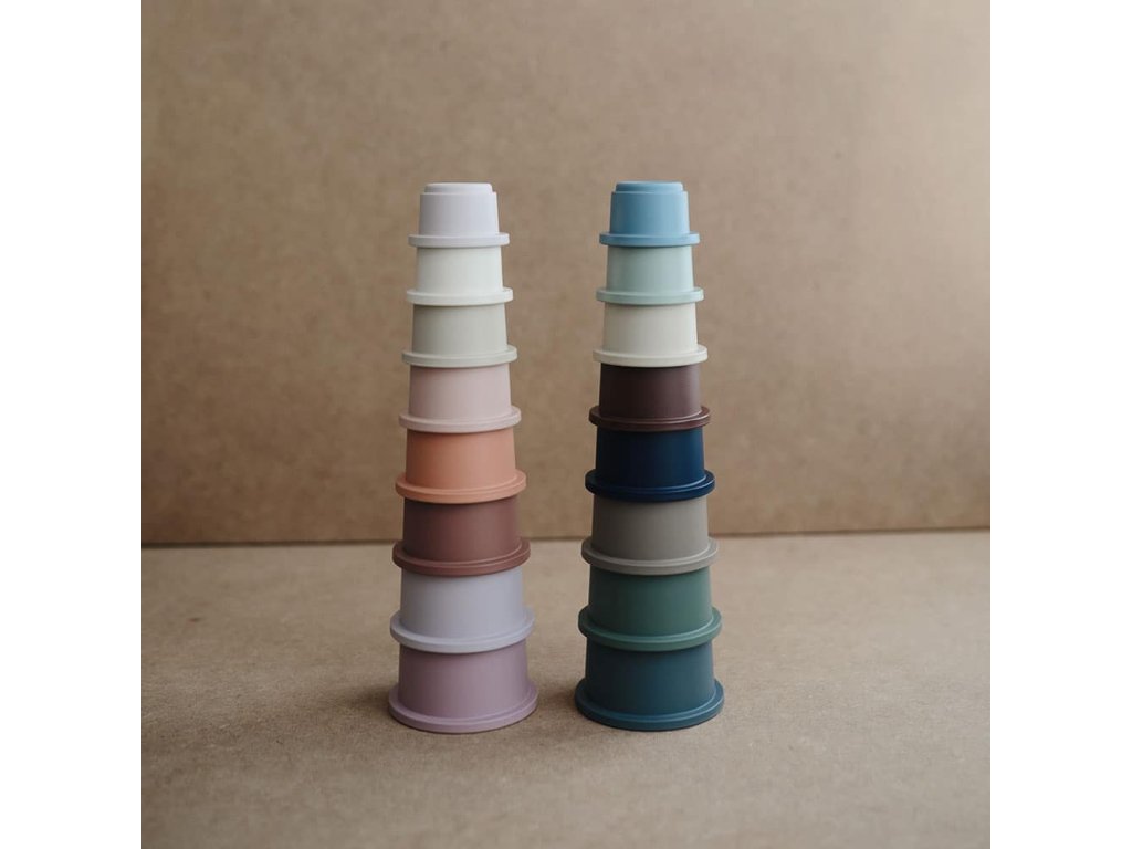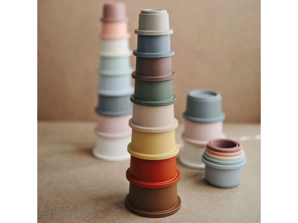 - stohovací skládací věž Mushie v jemných barvách působících pozitivně na vizuální vnímání dítěte