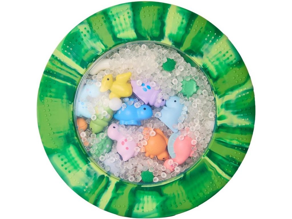 Měkký silikonový disk s průhledným okénkem ukrývá drobné nezávadné figurky a kuličky, které mohou děti mačkat, tisknout, posouvat, hledat, natahovat i pátrat po skrytých pokladech. Oblíbená hra „hledej a najdi!“ tak dostává nový rozměr a nikdy se neomrzí. Hračka je ideální pro malé ručičky, které milují mačkání, objevování a zkoumání dotykem.