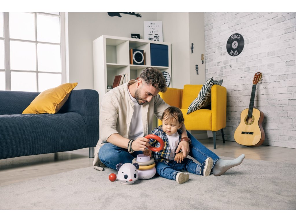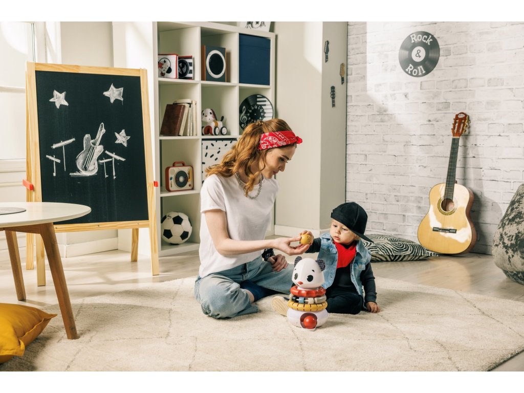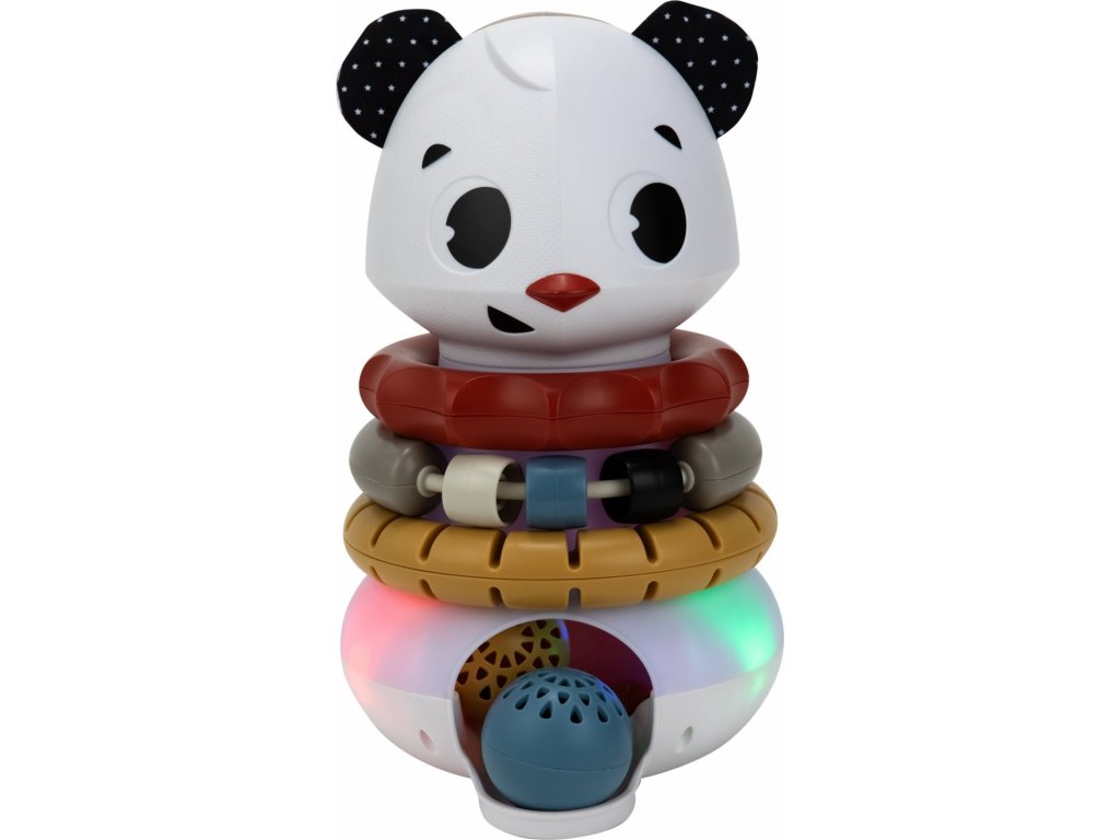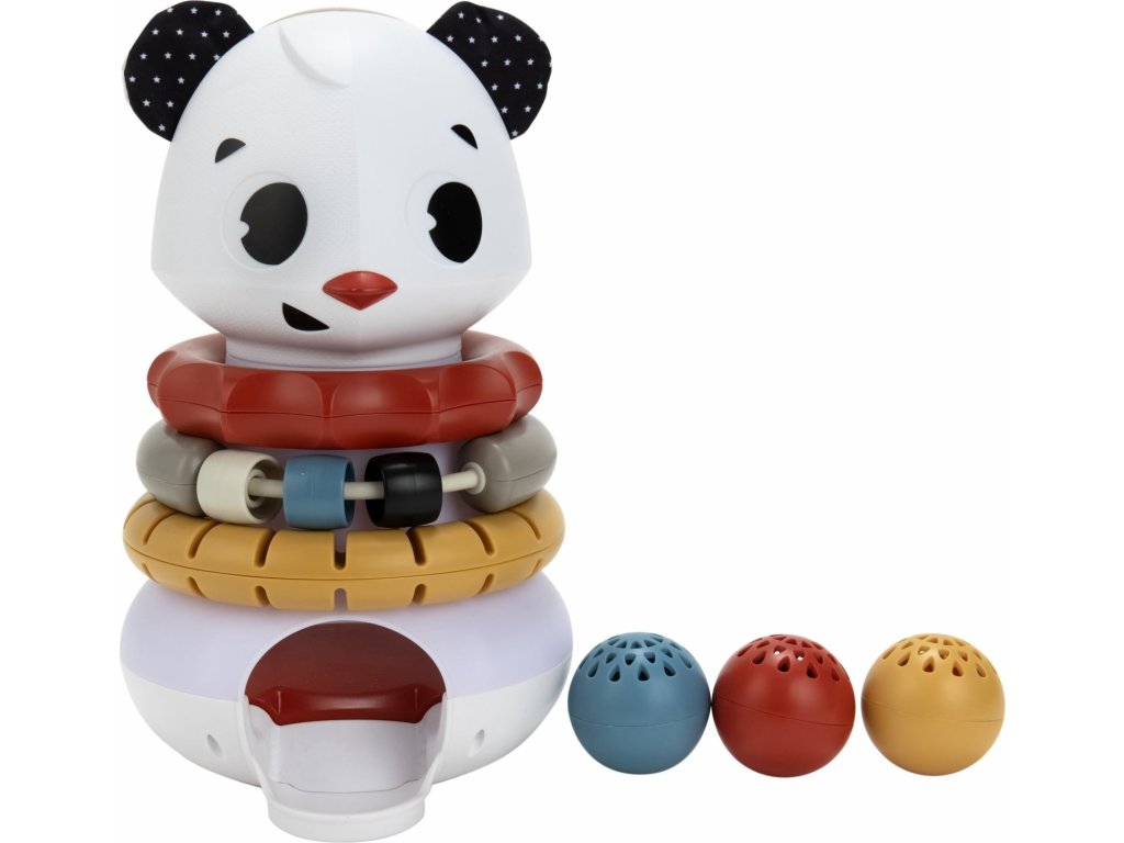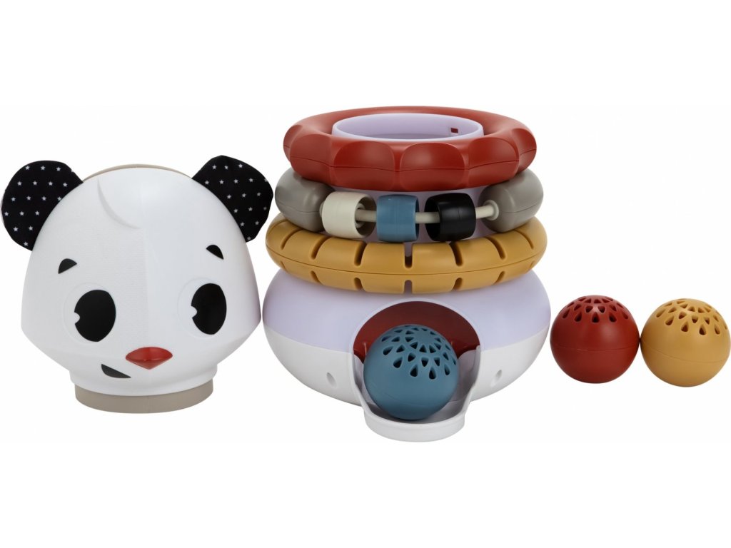 Interaktivní hračku Tiny Love v podobě roztomilé pandy tvoří základna, na kterou se nasazují tři kroužky a hlavička pandy. Uvnitř se skrývají tři barevné chrasticí míčky, které při vhození do otvoru v horní části základny odmění dítě blikáním světýlek a zábavnými zvuky. Nasazovací barevné kroužky nabízí různorodé textury ke zkoumání.