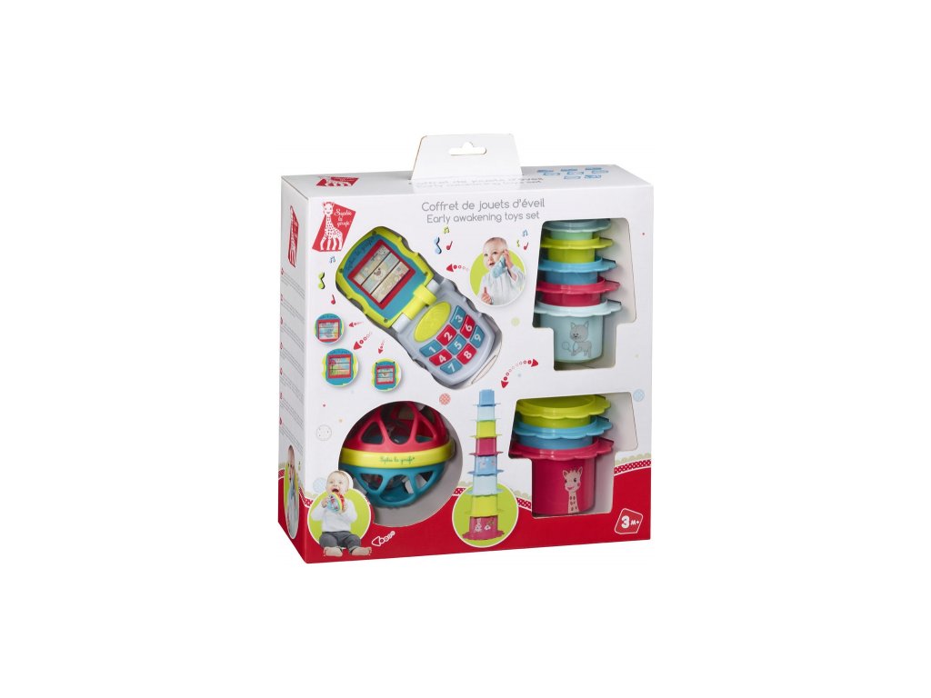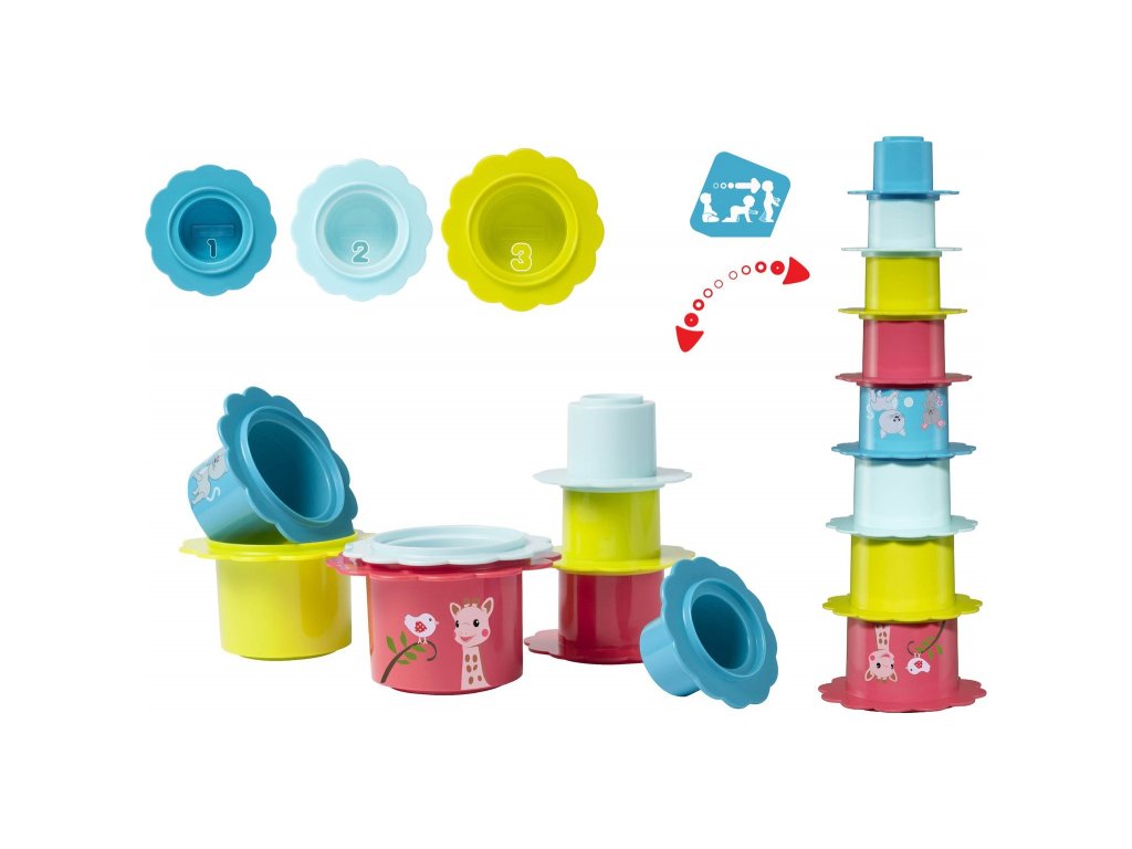8 pestrobarevných pohárků ve tvaru kytiček s dekoracemi žirafky Sophie a jejích přátel. Existuje spousta různých způsobů jak si s nimi hrát, pomáhají dítěti v různých stádiích jeho vývoje. Vzory žirafy Sophie stimulují dětskou fantazii a pobízí jej vymýšlet si své vlastní příběhy. Pokud pohárky naplníte vodou, dítě tak zjišťuje rozdíl mezi prázdným/plným a lehkým/těžkým.
