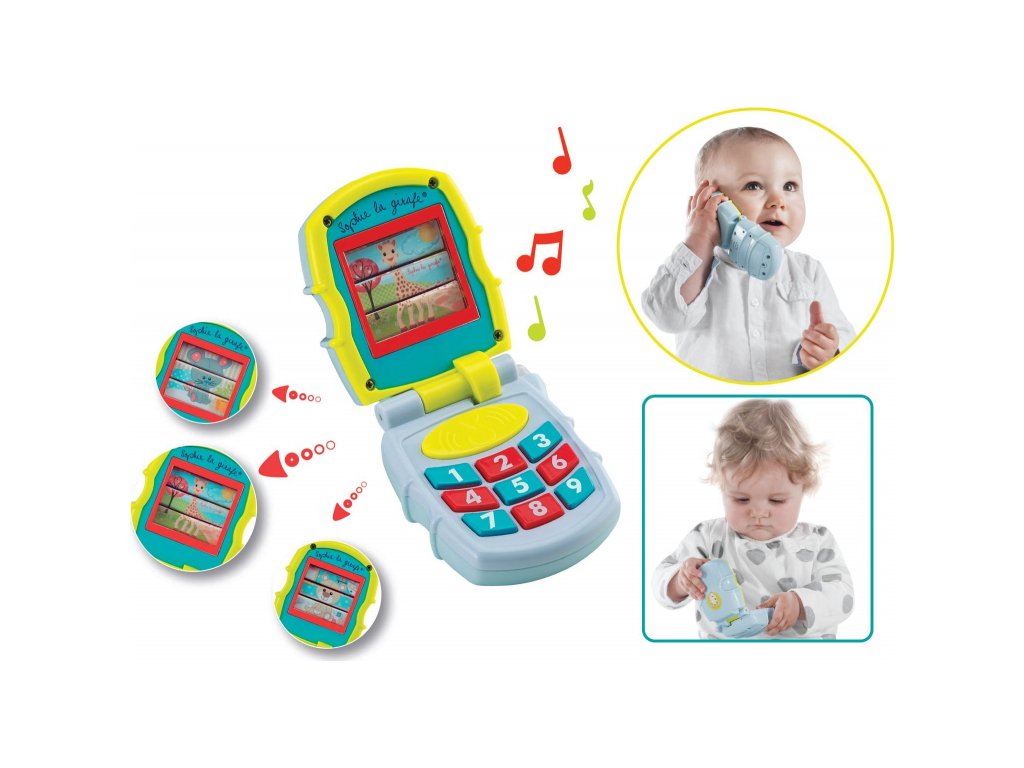 - sklopný mobilní telefon se snadno otevírá a zavírá, na obrazovce se pak objeví žirafka Sophie a její kamarádi méďa Gabin a myška Josephine